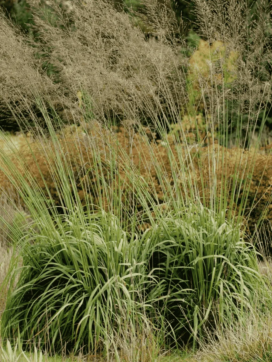 Молиния тростниковая Fontane (Molinia caerulea subsp. arundinacea) — элегантная многолетняя трава семейства Злаки, покоряющая своей утончённой красотой и благородством облика. Стройные стебли высотой до двух метров устремляются вверх подобно тонким стрелам, создавая воздушную композицию среди ландшафта. Листья узколинейной формы, длинные и гибкие, окрашены в нежнейшие оттенки зелёного цвета, плавно переходящие в золотисто-жёлтые тона осенью, когда растение словно одевается в роскошь осеннего солнца. Цветёт молиния мелкими, собранными в пышные метельчатые соцветия цветами, придающими ей особую лёгкость и очарование. Эти воздушные кисти колышутся над травостоем, наполняя пространство мягким шёпотом ветра и игрой света. Растение предпочитает влажные почвы и полутень, распространено преимущественно в умеренных зонах Европы и Азии, где оно украшает берега водоёмов, лесные поляны и сырые луга, придавая природному пейзажу изысканность и гармонию.