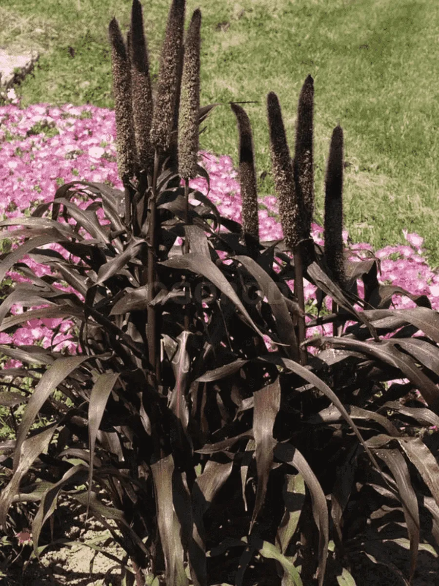 Пеннисетум *Purple Baron* пленяет взор своей изысканной декоративностью и благородством форм. Это травянистое растение образует плотную кустистую розетку изумрудно-зелёных узких листьев, слегка волнистых по краям и покрытых нежной серебристо-фиолетовой дымкой, придающей растению таинственный шарм. Листья постепенно приобретают насыщенный пурпурный оттенок ближе к осени, создавая контраст с золотистыми оттенками окружающих растений. Цветёт пеннисетум эффектными пушистыми метёлками длиной до 45 см, состоящими из множества мелких цветков тёмно-пурпурного цвета, словно бархатные кисти, возвышающиеся над листвой подобно элегантному султану. Растение предпочитает солнечные места, хорошо дренированные почвы и умеренное увлажнение, быстро разрастаясь и формируя живописные группы, способные украсить любой садовый ансамбль.