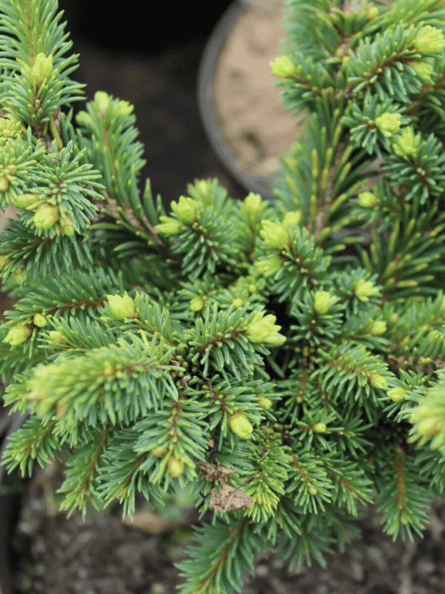 Ель обыкновенная сорта *Kamon* представляет собой стройную пирамидальную красавицу с густым ветвлением и плотной кроной, достигающей высоты до трёх метров. Её ветви расположены горизонтально, слегка свисают книзу, придавая дереву благородство и величественность. Иглы короткие, мягкие, нежно-зелёного цвета с серебристо-голубым отливом, придающим растению особую декоративность и воздушность. Цветёт растение мелкими невзрачными шишечками, едва заметными среди густой хвои. Растёт медленно, предпочитая солнечные места и плодородные почвы, легко адаптируется к городским условиям, устойчива к загрязнению воздуха и зимним холодам. Этот сорт идеально подходит для одиночных посадок, живых изгородей и ландшафтных композиций, украшая сады своей изысканной красотой круглый год.