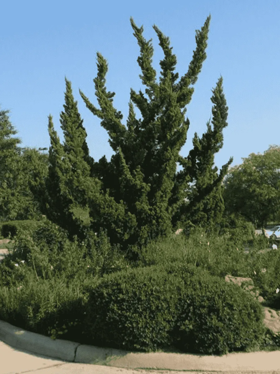 Можжевельник китайский сорта *Hollywood* представляет собой живописную вечнозелёную кустарниковую породу с густой пирамидальной кроной, достигающей высоты до трёх метров. Его ветви устремлены вверх, создавая стройный силуэт, подчёркивающий элегантность формы. Листья игловидные, тонкие и короткие, густо покрывают побеги, придавая растению насыщенный тёмно-зелёный оттенок, который сохраняет свою свежесть круглый год. Цветёт редко и незаметно мелкими невзрачными цветами, однако декоративная ценность кроется именно в изумрудной зелени хвои и строгих очертаниях куста. Растение отличается медленным ростом, устойчивостью к неблагоприятным условиям среды и неприхотливостью в уходе, благодаря чему широко используется в ландшафтном дизайне для формирования живых изгородей, солитёров и композиций в садах и парковых зонах.