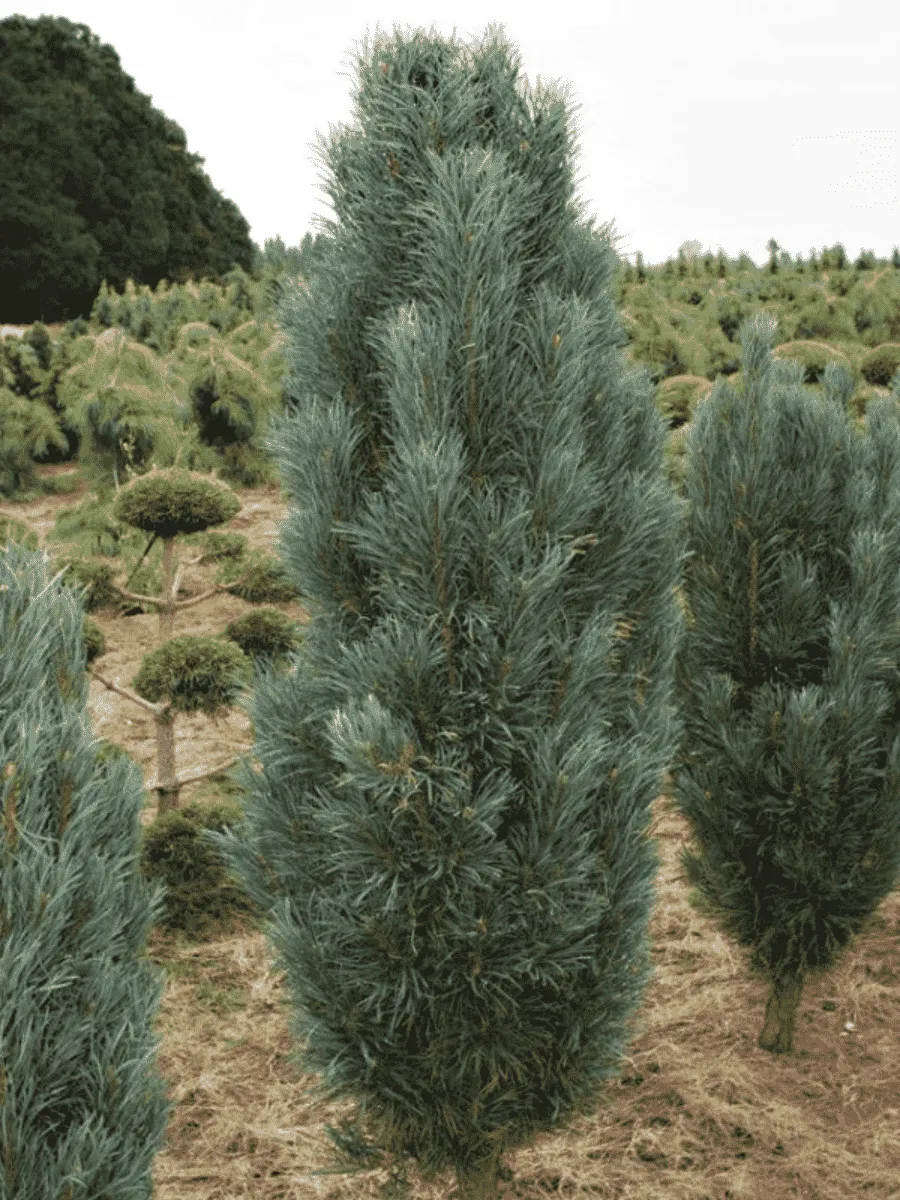 Сосна обыкновенная Fastigiata — стройная колонновидная форма сосны, поражающая своей величественной вертикальностью и строгим благородством облика. Её густые ветви расположены горизонтально, плотно прижаты друг к другу, создавая плотную пирамидальную крону, устремлённую вверх подобно остроконечной башне старинной крепости. Иглы хвои короткие, тёмно-зелёные, собраны в пучки по две штуки, придают дереву изысканный бархатистый оттенок даже зимой. Весной дерево украшается мелкими красноватыми шишечками, придающими особую декоративность. Растёт медленно, сохраняя компактность формы долгие годы, идеально подходит для небольших садов и парков, где ценится её элегантность и способность создавать живописные акценты среди зелёных насаждений.