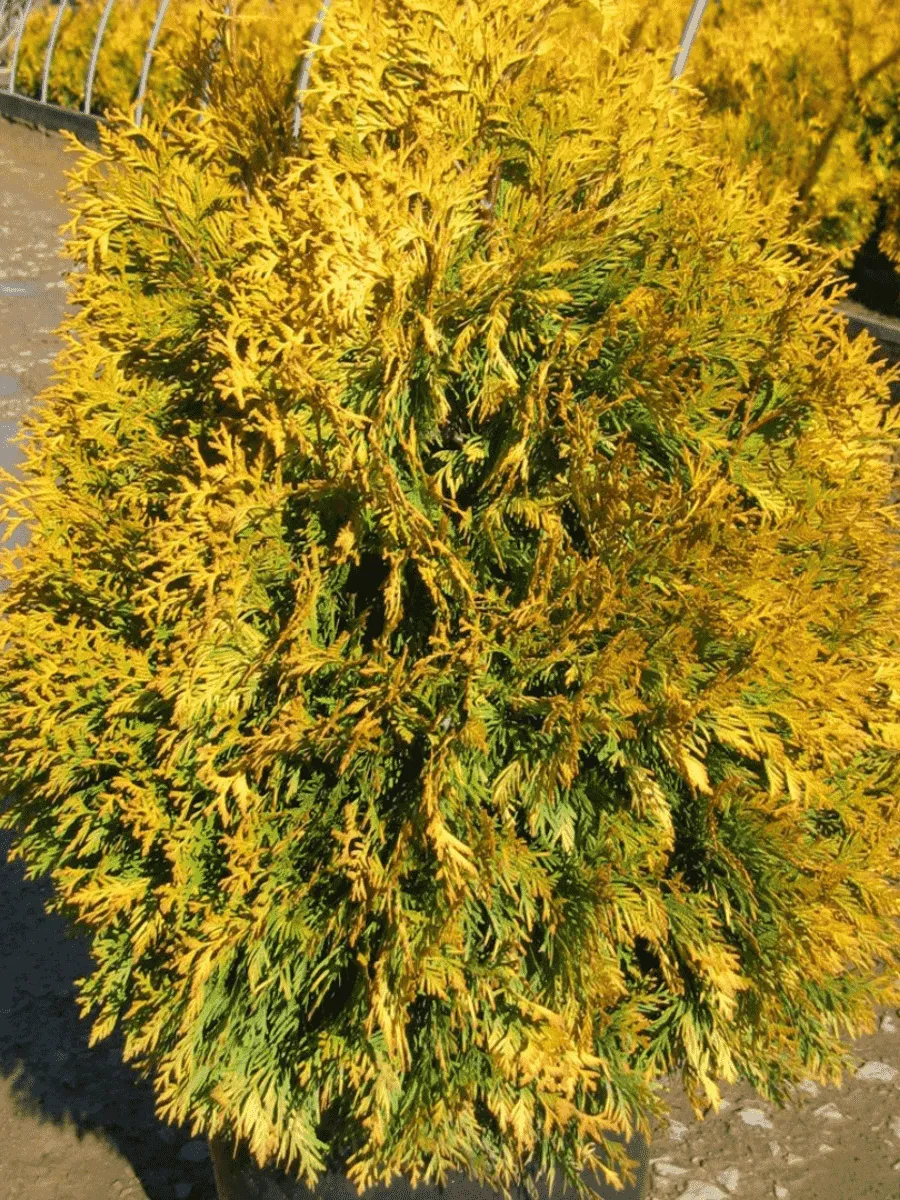 Туя восточная 'Golden Minaret' представляет собой стройную пирамидальную красавицу высотой до трёх метров с узкой кроной, устремлённой вверх подобно золотистому шпилю. Её густые ветви покрыты мелкими чешуевидными листьями насыщённого жёлтого цвета, приобретающими осенью нежнейшие оттенки оранжевого и бронзового золота. Эта вечнозелёная хвойница отличается медленным ростом, ежегодно прибавляя лишь несколько сантиметров, благодаря чему сохраняет свою компактность даже спустя годы. Цветёт растение скромно, практически незаметно, однако именно её декоративная листва привлекает внимание садоводов и ландшафтных дизайнеров, превращаясь в изысканный акцент сада. Прекрасно переносит стрижку и формовку, устойчива к городским условиям и зимним холодам средней полосы России, становясь украшением парков, аллей и частных участков.