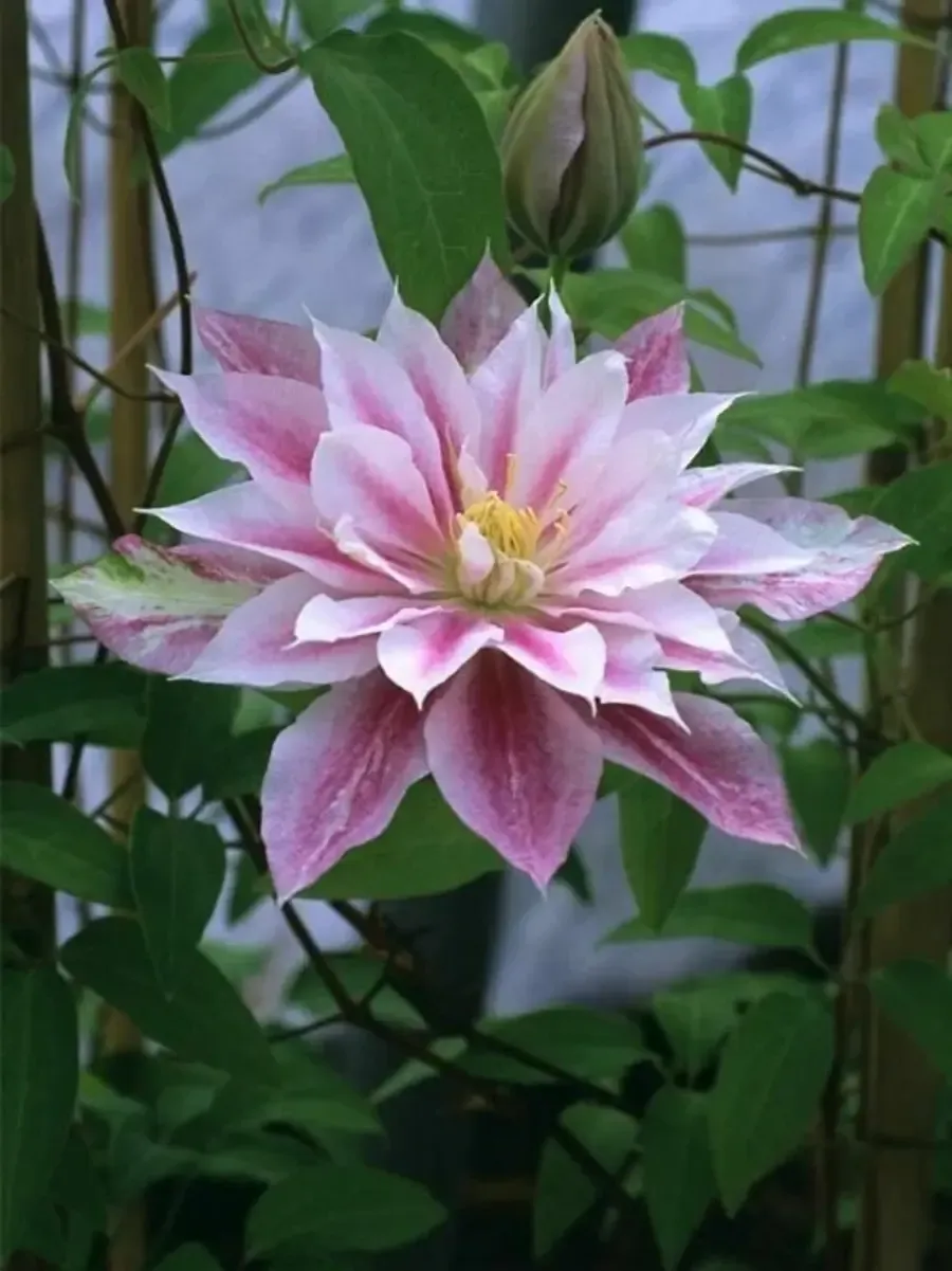 Клематис Андромеда — элегантная лиана с гибкими побегами, достигающими длины до трёх метров, украшенная крупными сердцевидными листьями насыщенного зелёного цвета, слегка блестящими от воскового налёта. Цветки крупные, диаметром около десяти сантиметров, распускаются одиночно либо небольшими группами, очаровывая нежной палитрой оттенков розово-лилового, переходящего в серебристо-сиреневый тон. Лепестков пять-шесть, широкие, бархатистые, словно покрытые тонким слоем пудры, придающей особую глубину цвету. Сердце цветка украшают многочисленные тычинки золотисто-жёлтого оттенка, контрастирующие с лепестковой гаммой. Период цветения продолжительный, начинается ранней весной и длится вплоть до середины лета, наполняя сад изысканным ароматом и живописностью. Растёт быстро, легко взбирается вверх по шпалерам, решёткам и другим вертикальным конструкциям, создавая эффектную живую ширму или декоративный акцент сада.