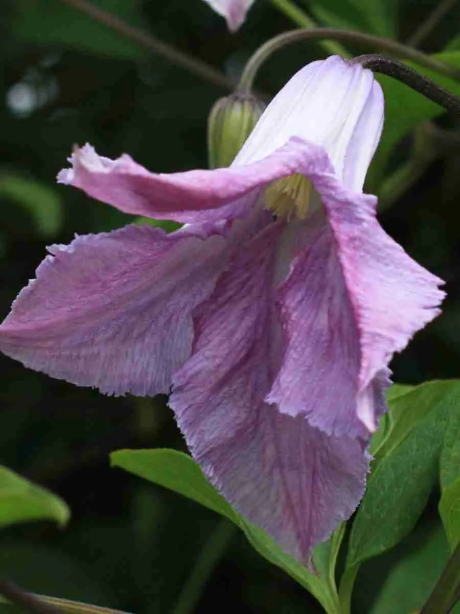 Клематис гибридный *Betty Corning* пленяет взор роскошной кроной густо покрытых крупными сердцевидными листьями насыщенного зелёного цвета, слегка блестящими от воскового налёта. Его побеги мощные, гибкие, легко цепляются за опоры благодаря тонким усикам, устремляясь вверх до трёх метров высотой. Цветки крупные, диаметром около десяти сантиметров, распускаются обильно и долго, начиная с июня и продолжаясь вплоть до первых заморозков. Лепестки нежнейшие, бархатистые, окрашены в глубокий винно-красный оттенок с едва заметным пурпурным переливом, контрастируя с золотистыми тычинками, придающими особую изысканность каждому бутону. Этот сорт предпочитает солнечные места, плодородную почву и умеренный полив, радуя садоводов своей неприхотливостью и способностью быстро разрастаться, превращая любой уголок сада в живописный уголок природы.