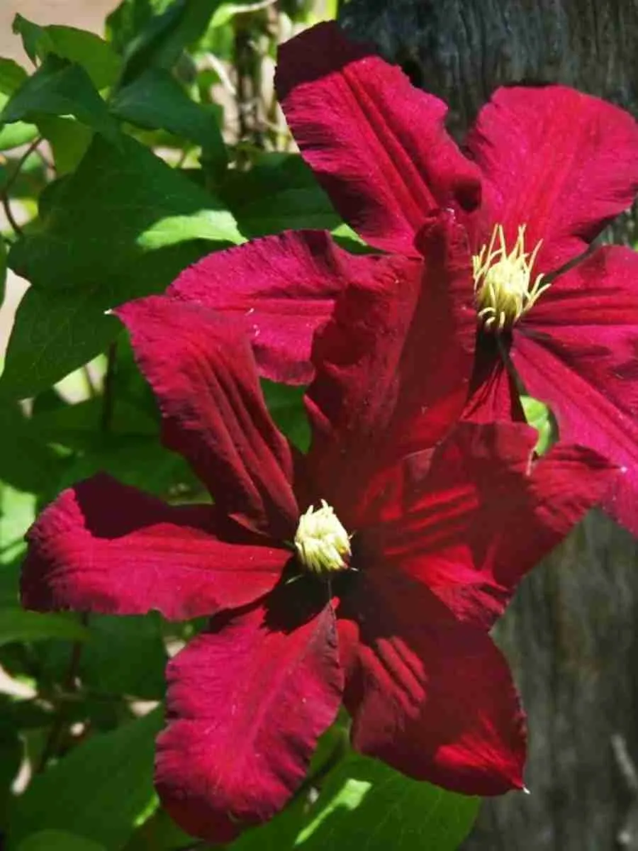 Клематис гибридный *Niobe* пленяет взор роскошной красотой крупных темно-красных цветков, словно капли расплавленного рубина, сияющих среди густой зелени лианоподобных стеблей. Листья перистые, рассечённые на несколько овальных листочков с зубчатыми краями, создают живописную ажурную крону, подчёркивая изысканность каждого цветка. Цветки одиночные либо собраны в небольшие группы, раскрываются широко раскрытыми чашевидными венчиками диаметром до 15 см, состоящими из четырёх широких лепестков-лепестников, плавно переходящих от насыщенного красного оттенка к тёмному бархатисто-чёрному центру. Бутоны появляются уже в конце весны и радуют глаз вплоть до осени, превращаясь в пышный каскад ярких красок, украшающий стены домов, беседки и арки садов. Гибкий побег клематиса легко цепляется за опоры тонкими усиками, позволяя растению стремительно подниматься вверх, достигая высоты до трёх метров и создавая эффектные вертикальные композиции.