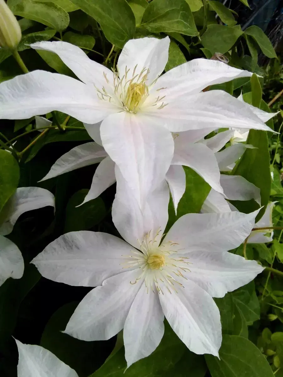 Клематис гибридный Roko-Kolla очаровывает своей элегантностью и утончённостью, представляя собой мощную лиану с гибкими побегами, достигающую высоты до трёх метров. Листья крупные, тёмно-зелёные, блестящие, рассечённые на несколько овальных листочков с волнистым краем, придающих растению особую декоративность даже вне периода цветения. Цветки появляются в изобилии летом и осенью, поражают крупными размерами (до 15 см), насыщенным фиолетово-синим оттенком и бархатистостью лепестков, словно покрытых тонким слоем нежной пудры. Сердцевина цветка украшена контрастными жёлтыми тычинками, подчёркивающими изысканность композиции. Растёт быстро, легко адаптируется к различным условиям, предпочитая солнечные места и плодородные почвы, распространяя свою красоту в садах и парках, где становится настоящим украшением вертикального озеленения.