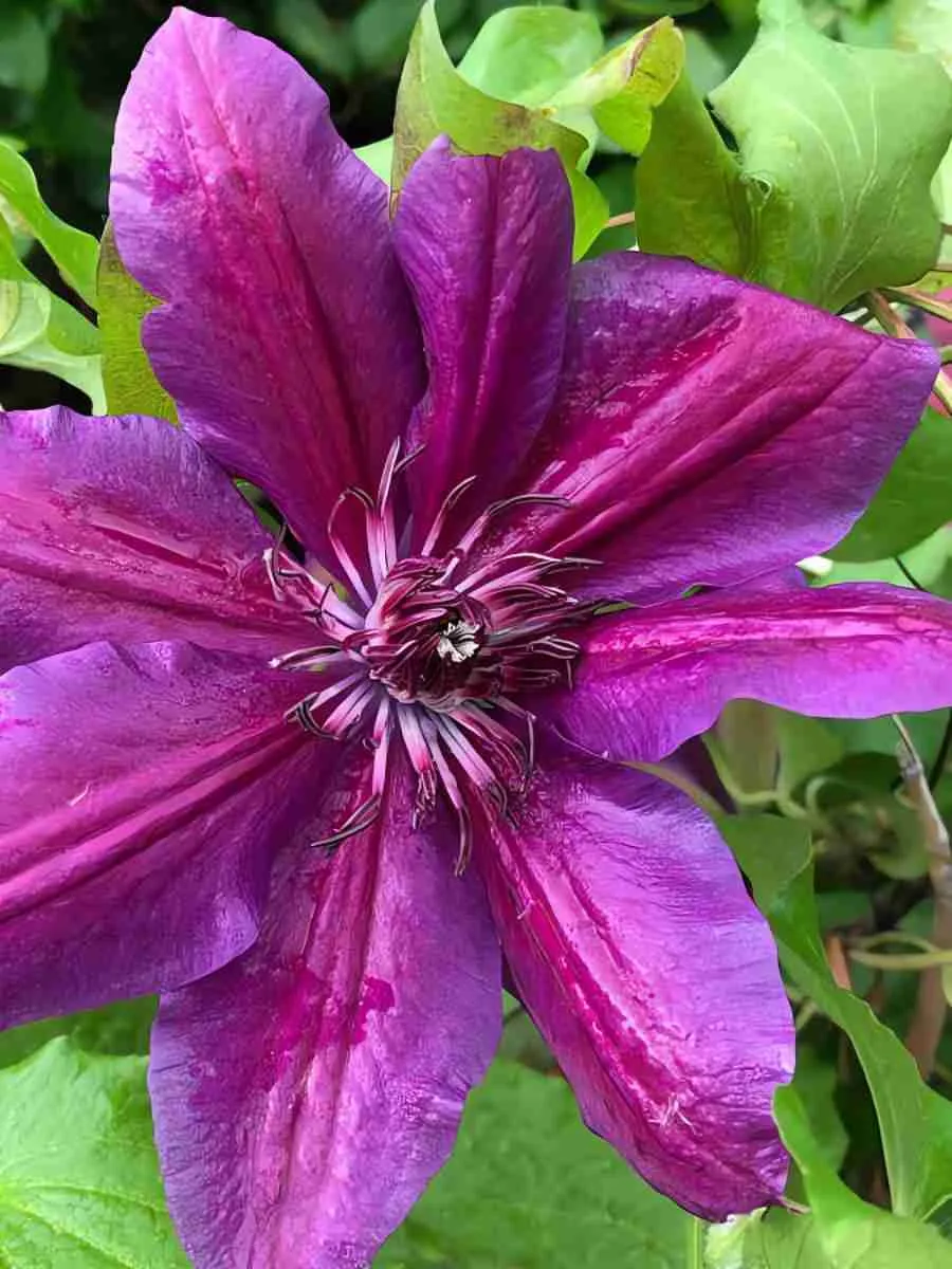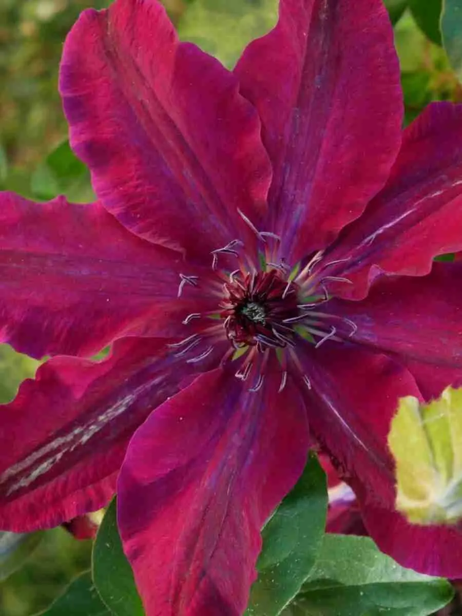 Клематис сорта *My Beauty* пленяет взор роскошной красотой крупных цветков насыщенного розово-красного оттенка, украшенных нежным белым глазком в центре каждого лепестка. Листья растения имеют сложную перистую структуру, состоящую из нескольких овальных листочков тёмно-зелёного цвета с глянцевой поверхностью, придающей растению изысканный блеск даже вне периода цветения. Мощная лиана быстро разрастается, достигая высоты до трёх метров, цепляясь гибкими побегами за опоры и создавая живописную зелёную завесу. Цветёт обильно и продолжительно, начиная с конца весны и вплоть до середины осени, наполняя сад яркими красками и очарованием пышных бутонов.