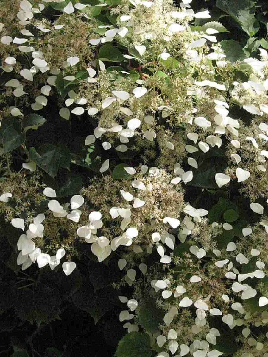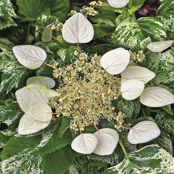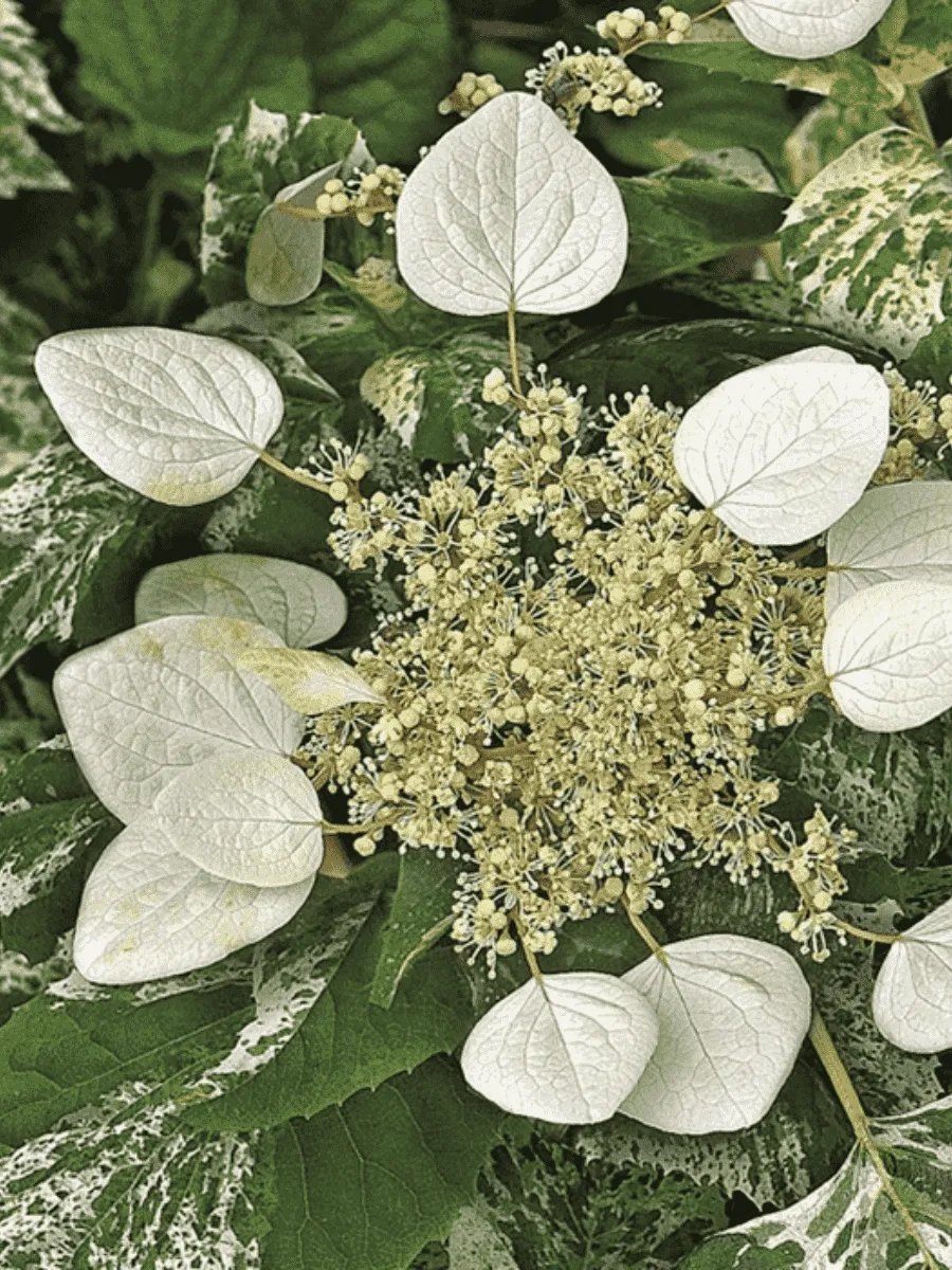Схизофрагма гортензиевидная сорта *Burst of Light* представляет собой элегантную лиану с нежной зеленью и воздушными соцветиями, покоряющую сердца садоводов своей утончённой красотой. Её побеги гибки и грациозны, легко взбираясь вверх по опоре, создавая живописные зелёные завесы. Листья крупные, сердцевидные, слегка волнистые по краям, окрашены в насыщенный изумрудный оттенок, который летом приобретает лёгкий золотистый отлив, словно солнечные лучи мягко касаются каждого листочка. Цветёт схизофрагма обильно и продолжительно, покрываясь крупными белыми щитковидными соцветиями, состоящими из множества мелких цветков, собранных в пышные шапки, похожие на букеты миниатюрных розочек. Эти цветы источают тонкий аромат, привлекающий насекомых-опылителей и наполняющий сад приятной свежестью. Растение предпочитает полутень и влажные почвы, прекрасно чувствует себя возле водоёмов или в тенистых уголках сада, где создаёт атмосферу спокойствия и гармонии.