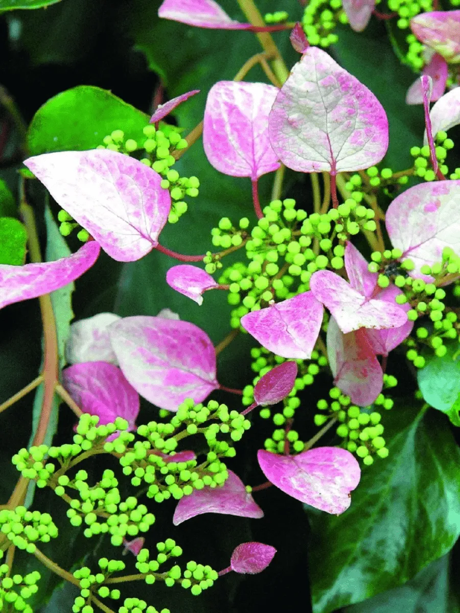 Схизофрагма гортензиевидная Roseum (Schizophragma hydrangeoides 'Roseum') — очаровательное листопадное растение семейства Адоксовые, покоряющее сердца садоводов нежностью цветения и элегантной листвой. Это кустарникоподобная древесная лиана высотой до трёх метров, обладающая гибкими побегами, легко цепляющимися за опоры благодаря особым выростам-присоскам. Листья крупные, сердцевидные, ярко-зелёные летом и окрашивающиеся осенью в насыщенные оттенки жёлтого и оранжевого цветов. Особого внимания заслуживает её роскошное цветение: многочисленные соцветия напоминают миниатюрные букеты розовых гортензий, состоящие из мелких цветков с белыми лепестками и яркими пурпурными чашелистиками, придающими растению особую декоративность. Цветёт схизофрагма обильно и продолжительно, начиная с конца мая и заканчивая серединой июля, украшая собой тенистые уголки сада и создавая атмосферу утончённой природной красоты.