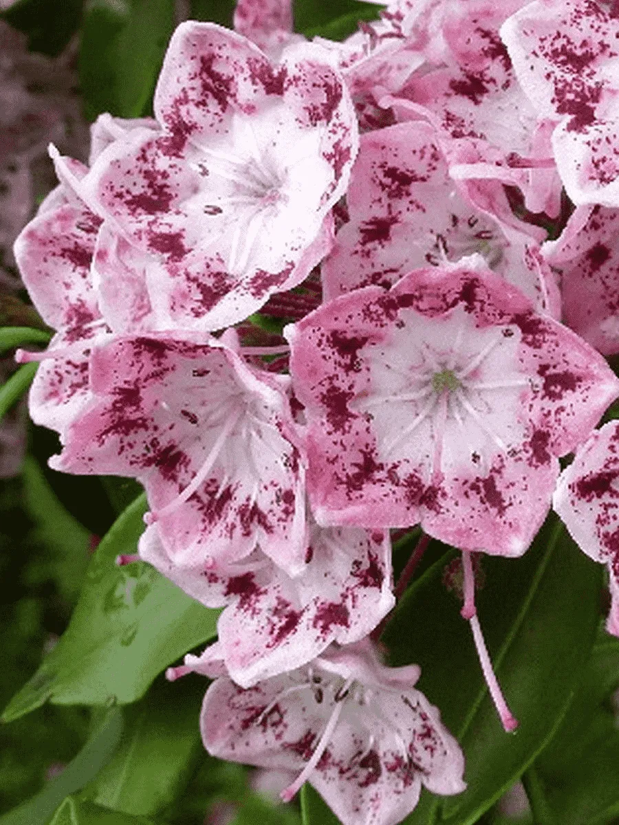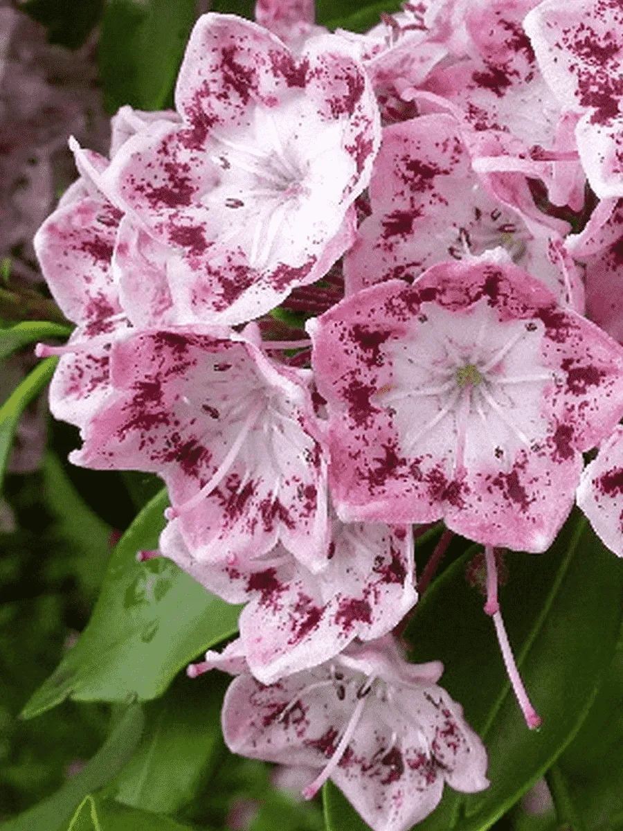 Кальмия широколистная сорта *Ideal* представляет собой компактный вечнозелёный кустарник высотой до полутора метров с густой кроной и прямостоячими побегами, покрытыми тёмной корой. Листья кожистые, блестящие, эллиптической формы, насыщенно-зелёного цвета сверху и слегка серебристые снизу, создают плотную декоративную массу даже вне периода цветения. Цветки крупные, воронковидные, собраны в пышные верхушечные соцветия, раскрываются одновременно, наполняя сад нежностью розово-лиловых оттенков. Период цветения продолжительный, начинается поздней весной и длится около трёх недель, привлекая внимание своей изысканной красотой и ароматом. Растёт медленно, предпочитает влажные кислые почвы и полутень, широко используется в ландшафтном дизайне благодаря эффектному внешнему виду и неприхотливости в уходе.