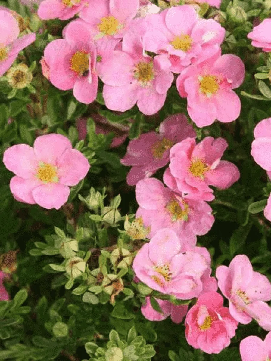 Лапчатка кустарниковая сорта *Pink Queen* представляет собой компактный декоративный куст высотой до одного метра с густой кроной и прямостоячими побегами, покрытыми нежной бархатисто-зелёной листвой. Листья мелкие, перисто-рассечённые, слегка блестящие, придают растению изысканный ажурный облик. Цветёт обильно и продолжительно, начиная с июня и вплоть до первых заморозков, покрываясь множеством крупных (до пяти сантиметров диаметром), махровых цветков насыщенно-розового оттенка с золотистым центром. Бутоны раскрываются постепенно, создавая эффект непрерывности цветения. Кустарник предпочитает солнечные места, хорошо переносит засуху и морозоустойчив, благодаря чему широко используется в ландшафтном дизайне парков, садов и частных участков, украшая пространство своей утончённой красотой и элегантностью.