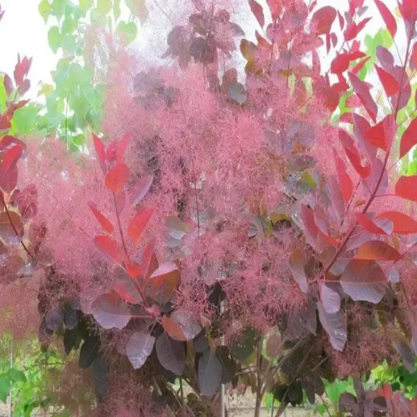 Скумпия кожевенная сорта *Grace* представляет собой живописную листопадную кустарниковую породу, достигающую высоты до трёх метров и обладающую раскидистой кроной с элегантной архитектурой ветвей. Листья скумпии крупные, овально-ланцетные, насыщенно-зелёные летом, осенью же приобретают яркие оттенки от золотисто-жёлтого до пурпурно-красного, создавая эффектную игру красок. Цветёт растение мелкими кремово-белыми цветами, собранными в пышные метельчатые соцветия, придающие кусту воздушность и лёгкость. Особенность сорта заключается в появлении характерных пушистых серёжек-плодиков после цветения, превращающих скумпию в декоративный акцент сада даже поздней осенью и зимой. Растение предпочитает солнечные места, хорошо переносит засуху и морозоустойчиво, широко используется в ландшафтном дизайне благодаря своей красоте и неприхотливости.