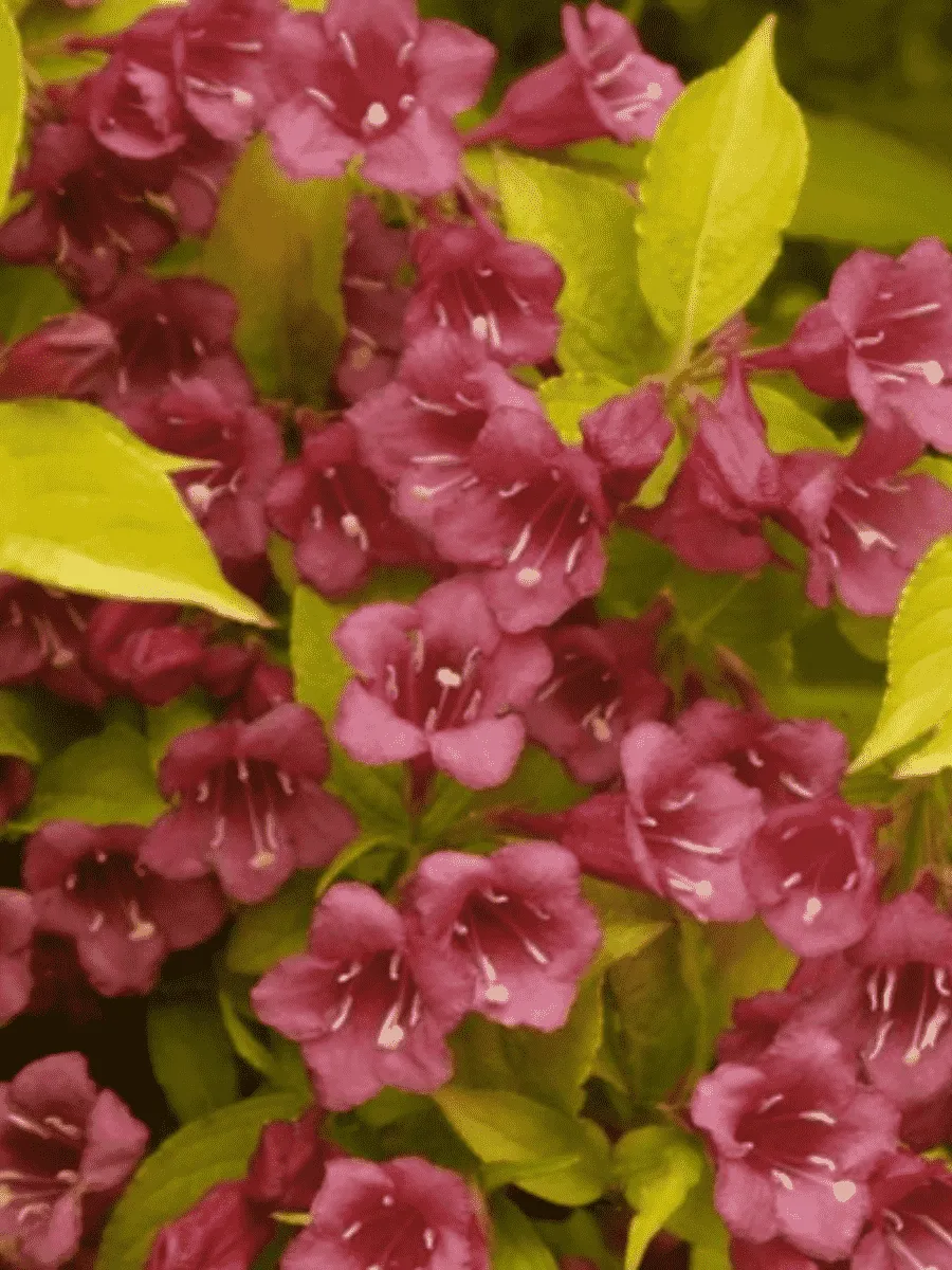 Вейгела цветущая сорта *Golden Jeans* пленяет взор своей изысканной красотой и нежностью форм. Это компактный кустарник высотой до полутора метров с густой кроной, состоящей из множества тонких ветвей, покрытых крупными овальными листьями насыщенного золотисто-жёлтого цвета, словно солнечные лучи застряли среди зелени сада. Листья слегка волнистые по краям, гладко блестящие сверху и матовые снизу, создают удивительный контраст оттенков, особенно заметный весной и летом. Цветёт растение обильно и продолжительно, начиная с конца мая и вплоть до июля, покрываясь множеством трубчатых цветков нежно-розового оттенка, собранных в небольшие соцветия-зонтики. Бутоны раскрываются постепенно, наполняя сад тонким ароматом и привлекая пчёл и бабочек. Растение предпочитает плодородную почву и солнечное местоположение, хорошо переносит стрижку и легко адаптируется к различным климатическим условиям, становясь украшением любого участка благодаря своему яркому облику и длительному периоду декоративности.
