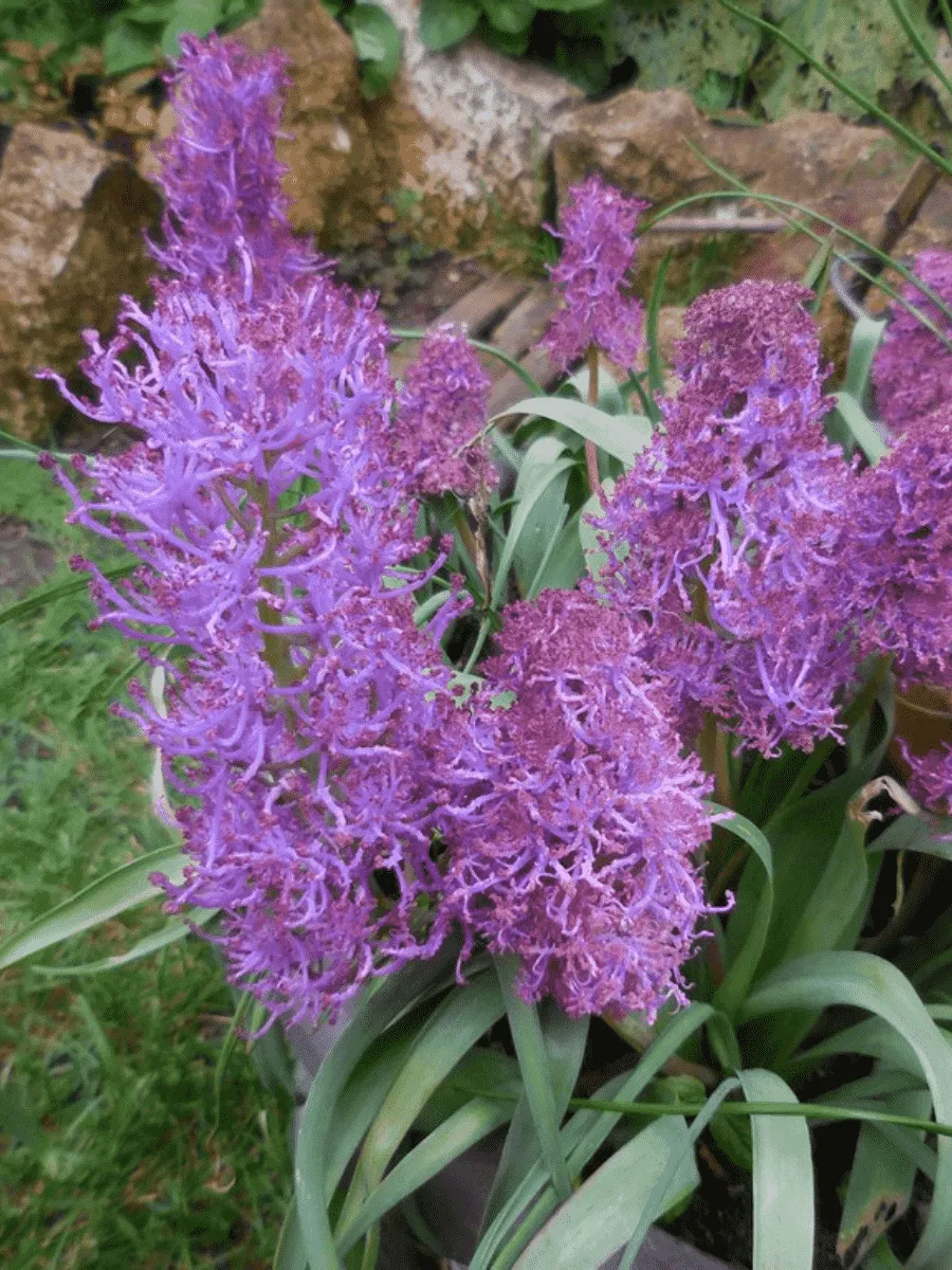 Мускари Плумозум (Muscari plumosum), также известный как Перистый мускари, пленяет взор своей изысканной красотой и утончённостью форм. Это миниатюрное растение высотой всего около десяти сантиметров обладает нежнейшими перисто-разделёнными листьями изумрудной окраски, придающими растению воздушность и лёгкость. Цветки собраны в рыхлые кистевидные соцветия, состоящие из множества мелких звёздчатых цветков нежно-голубого оттенка, словно сотканных из прозрачной утренней дымки. Бутоны раскрываются постепенно снизу вверх, создавая впечатление медленно распускающегося цветка. Период цветения приходится на раннюю весну, когда природа ещё только просыпается от зимнего сна. Растёт преимущественно на солнечных участках, предпочитая плодородную почву и умеренный полив. Благодаря своему декоративному виду широко используется в ландшафтном дизайне, украшая альпийские горки, рокарии и миксбордеры.