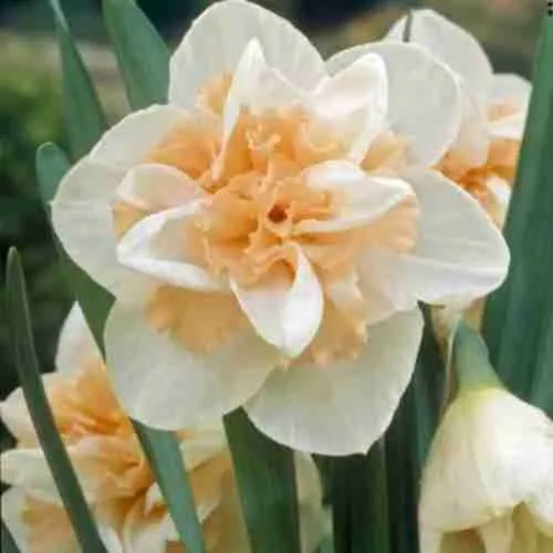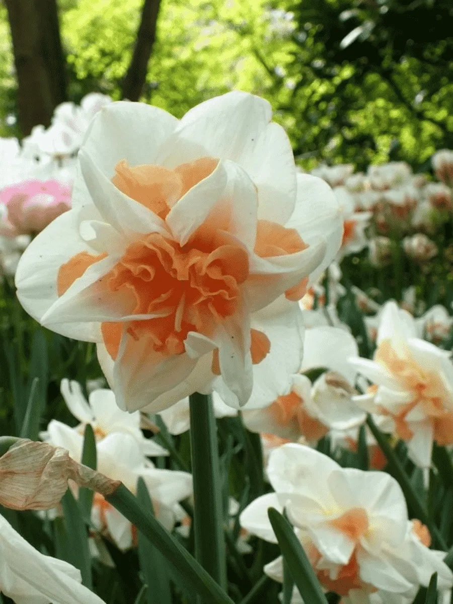 Нарцисс сорта *Delnashaugh* пленяет взор изысканным сочетанием нежности и благородства форм. Его листья узколанцетные, ярко-зелёные, гладко блестящие, словно покрытые тонким слоем воскового блеска, образуют компактную розетку, подчёркивая стройность стебля высотой около тридцати сантиметров. Цветки крупные, одиночные, располагаются на концах прямостоячих цветоносов, раскрываясь навстречу весеннему солнцу. Околоцветник состоит из шести широколанцетных лепестков чистого белого цвета, контрастирующих с крупной оранжево-жёлтой коронкой, имеющей волнистое гофрированное строение и украшенной мелкими зубчиками по краю. Аромат цветка тонкий, едва уловимый, придаёт саду особую атмосферу свежести и чистоты. Растение предпочитает солнечные места, хорошо дренированные почвы и умеренный полив, размножается луковицами, легко адаптируется к различным климатическим условиям, радуя садоводов своим великолепием ежегодно весной.