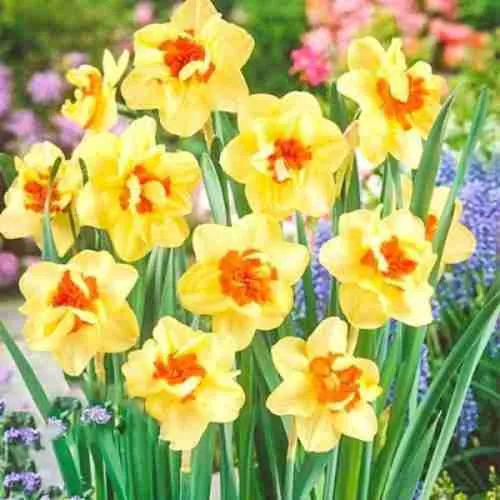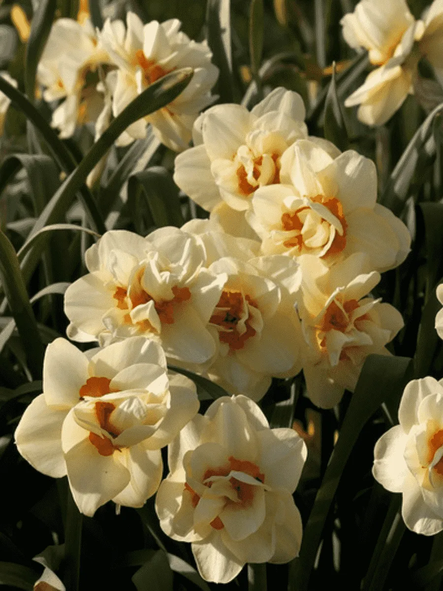 Нарцисс Double Fashion пленяет взор изысканным сочетанием нежности и роскоши, представляя собой элегантную садовую классику. Его листья узколанцетной формы собраны в плотную розетку, окрашены насыщенным зелёным цветом и слегка блестят на солнце, подчёркивая утончённую красоту цветка. Бутоны раскрываются крупными махровыми соцветиями диаметром около восьми сантиметров, демонстрируя многослойность лепестков, плавно переходящих от белоснежного основания к нежно-розовому краю. Серединка цветка украшена контрастным жёлтым кольцом, придающим нарциссу особую декоративность и очарование. Цветёт растение обильно и продолжительно, начиная с конца апреля до середины мая, наполняя воздух тонким ароматом весны. Предпочитает солнечные места с плодородной почвой, легко размножается луковицами и прекрасно подходит для оформления клумб, бордюров и миксбордеров, создавая атмосферу весеннего праздника и гармонии природы.