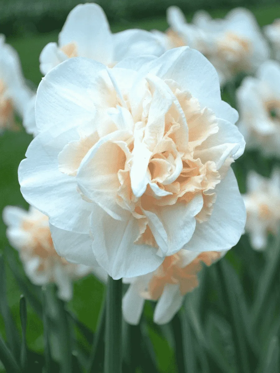 Нарцисс *Pink Champagne* пленяет взор нежностью пастельных оттенков и утончённой грацией цветения. Его длинные узколанцетные листья тёмно-зелёного цвета образуют пышную розетку, подчёркивая стройность стебля высотой до 45 см. Бутоны раскрываются крупными чашевидными цветами диаметром около 10–12 см, демонстрируя изысканное сочетание нежно-розовых лепестков коронки и кремово-белых сегментов околоцветника. Аромат цветка тонкий, едва уловимый, словно лёгкое дуновение весеннего ветерка. Цветёт нарцисс *Pink Champagne* обильно и продолжительно, начиная с конца апреля и заканчивая серединой мая, украшая сады и парки своими воздушными соцветиями. Предпочитает солнечные места с плодородной рыхлой почвой, легко размножается луковицами, постепенно формируя живописные группы растений.