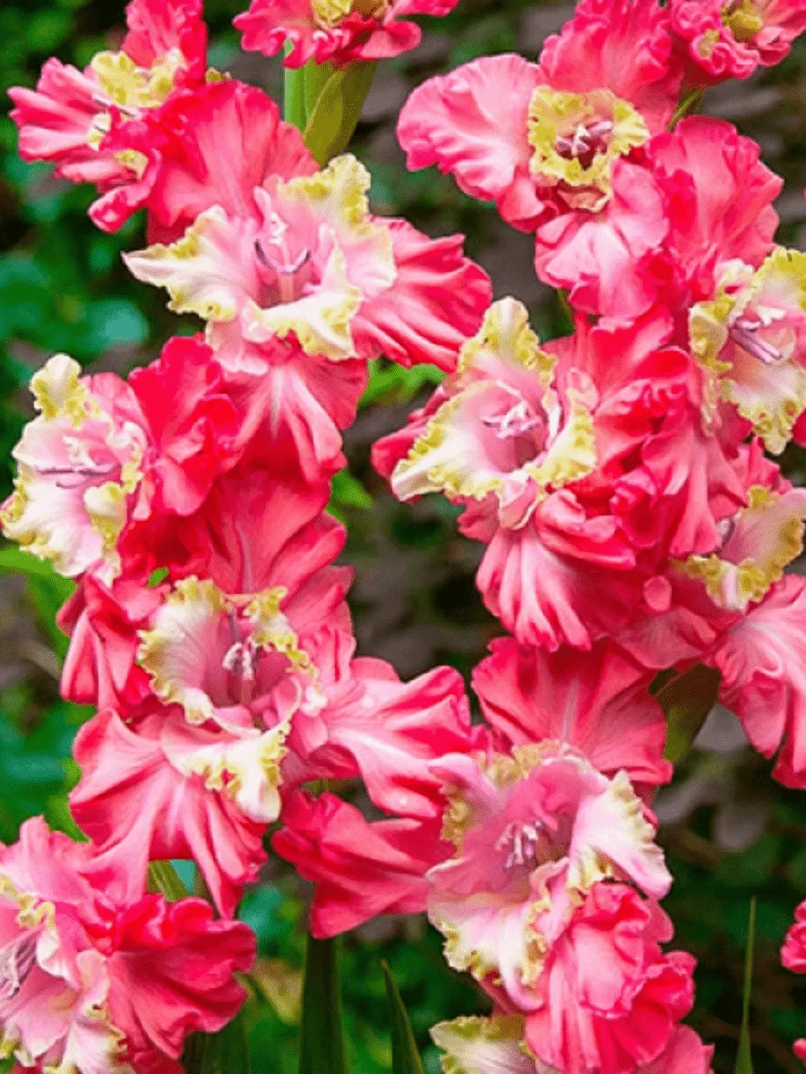 Гладиолус сорта *Broken Heart Frizzle* пленяет взор изысканным сочетанием нежности и экстравагантности. Его высокие стройные стебли достигают полутора метров высоты, увенчанные роскошными соцветиями, состоящими из множества крупных цветков, словно сотканных из кружевной ткани. Лепестки цветов волнистые, слегка закрученные по краям, создавая впечатление легкости и воздушности. Окраска лепестков варьируется от нежно-розового до насыщенного малинового оттенка, переходящего в пурпурный центр цветка, подчеркивая глубину и богатство цвета. Листья узколинейные, длинные и острые, темно-зелёного тона, придающие растению элегантность и строгость силуэта. Цветёт гладиолус продолжительно, радуя глаз яркими красками с июля по сентябрь. Предпочитает солнечные места и плодородную почву, легко адаптируется к различным климатическим условиям, демонстрируя свою неприхотливость и стойкость.