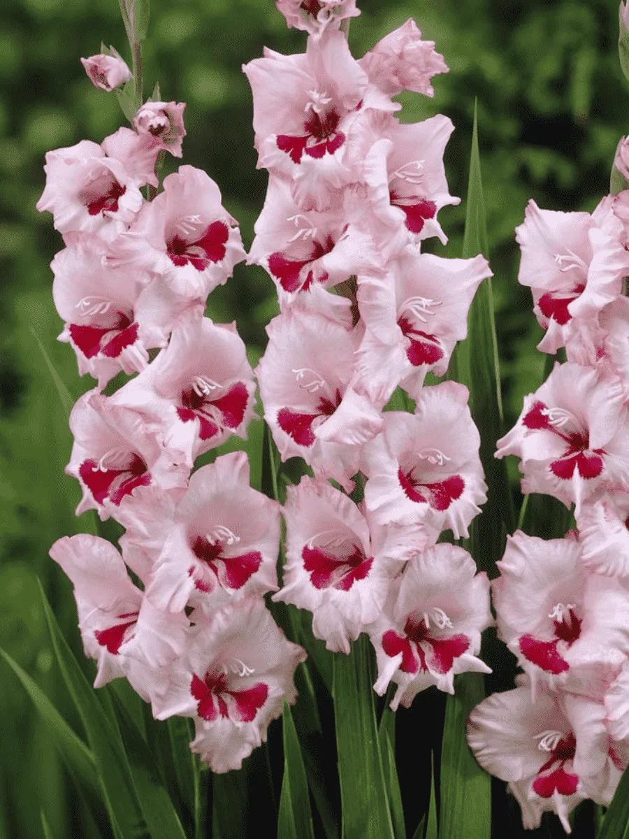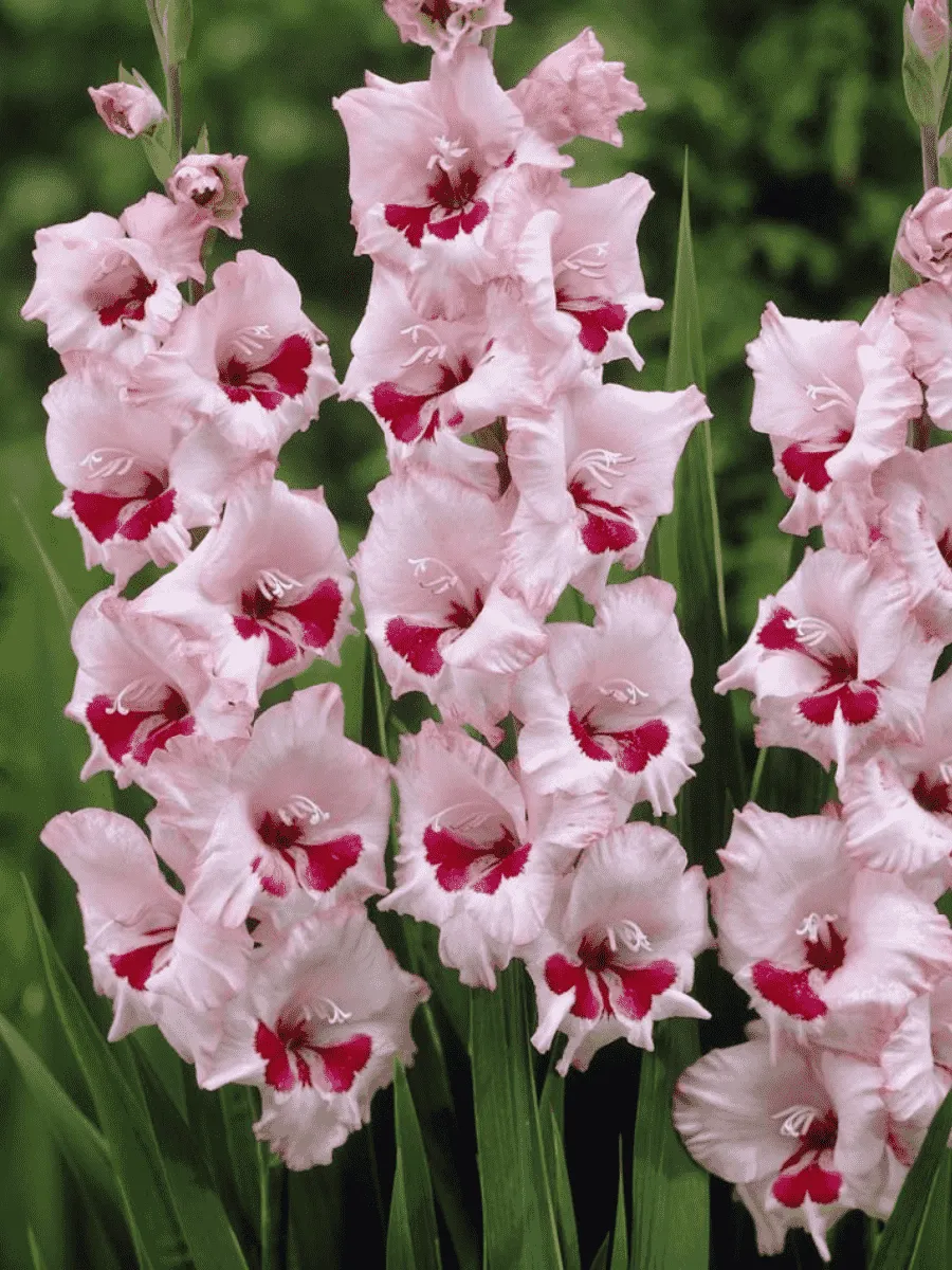 Гладиолус Wine & Roses очаровывает своей утончённой красотой и благородством форм. Высокий стройный стебель достигает метра высоты, увенчанный роскошной кистью крупных цветков, словно собранных художником-пейзажистом в изысканное соцветие. Листья узколинейные, длинные и острые, напоминают зелёные мечи, устремлённые вверх, подчёркивая вертикальную динамику всего облика растения. Цветки раскрываются постепенно снизу вверх, демонстрируя градацию оттенков от нежнейшего розового до насыщенного винно-красного цвета, создавая впечатление переливающегося шёлкового полотна. Бутоны имеют бархатисто-матовую поверхность, слегка мерцают на солнце, придавая растению особую привлекательность. Этот гладиолус предпочитает солнечные участки и плодородную почву, радуя садоводов своим продолжительным цветением и способностью украшать клумбы и букеты вплоть до наступления первых осенних холодов.