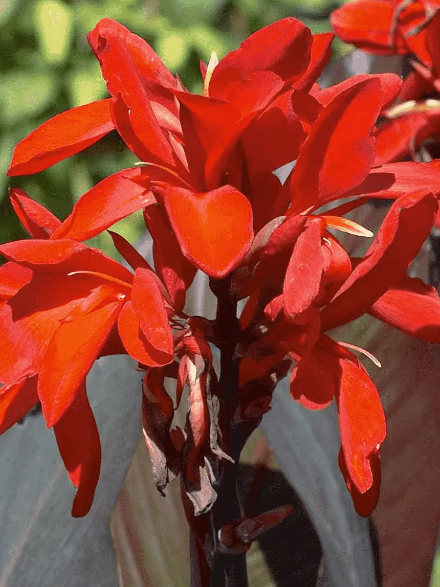 Канна *Red Futurity* пленяет взор роскошной зеленью крупных овальных листьев насыщенного изумрудного оттенка, украшенных тонкими пурпурными прожилками, придающими растению особую изысканность и благородство. Стройные стебли высотой до полутора метров несут крупные соцветия, состоящие из множества ярких цветков глубокого рубинового цвета, словно капли драгоценного вина, сверкающие на солнце. Цветки обладают бархатистым отливом лепестков и элегантно выгнутыми тычинками золотистого тона, подчеркивающими утончённую красоту каждого бутона. Растение предпочитает солнечные места, хорошо дренированные почвы и умеренный полив, демонстрируя свою неприхотливость и способность адаптироваться даже в условиях российского климата. Благодаря своей декоративности и пышному продолжительному цветению канна *Red Futurity* становится истинным украшением садов и парков, притягивая восхищённые взгляды ценителей прекрасного.