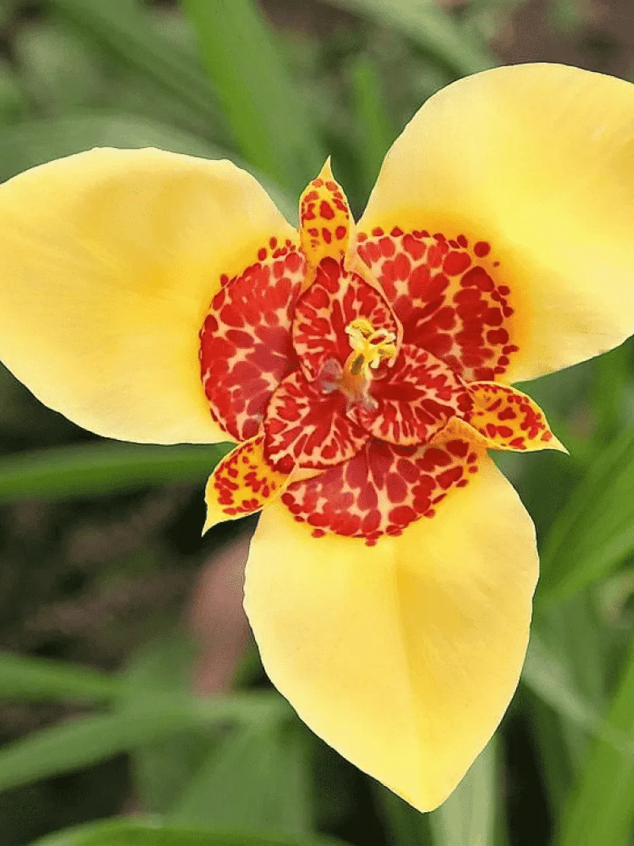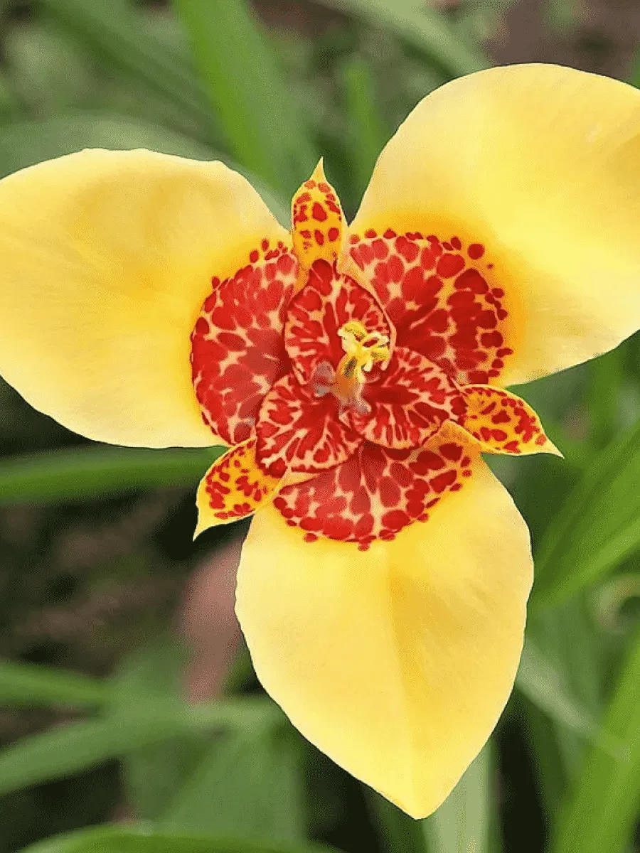 Тигридия Yellow — изысканное луковичное растение родом из Мексики, покоряющее сердца садоводов нежностью своей красоты и элегантностью форм. Листья её узколанцетные, светло-зелёные, слегка блестящие, словно покрытые тонким слоем утренней росы, образуют пышную розетку, подчёркивая стройность стебля высотой до полуметра. Но истинная прелесть тигридии раскрывается во время цветения: крупные цветки диаметром около восьми сантиметров распускаются один за другим, каждый живёт всего сутки, однако именно эта эфемерность придаёт растению особую притягательность. Лепестки цветка окрашены в солнечно-жёлтый оттенок, украшенные тонкими пурпурными штрихами, будто художник небрежно провёл кистью по холсту, создавая неповторимый рисунок. Цветение начинается летом и продолжается до осени, превращая сад в живописную палитру ярких красок. Тигридию ценят за неприхотливость и способность адаптироваться к различным условиям выращивания, она легко размножается дочерними луковицами и прекрасно подходит для оформления клумб, миксбордеров и контейнерных композиций.