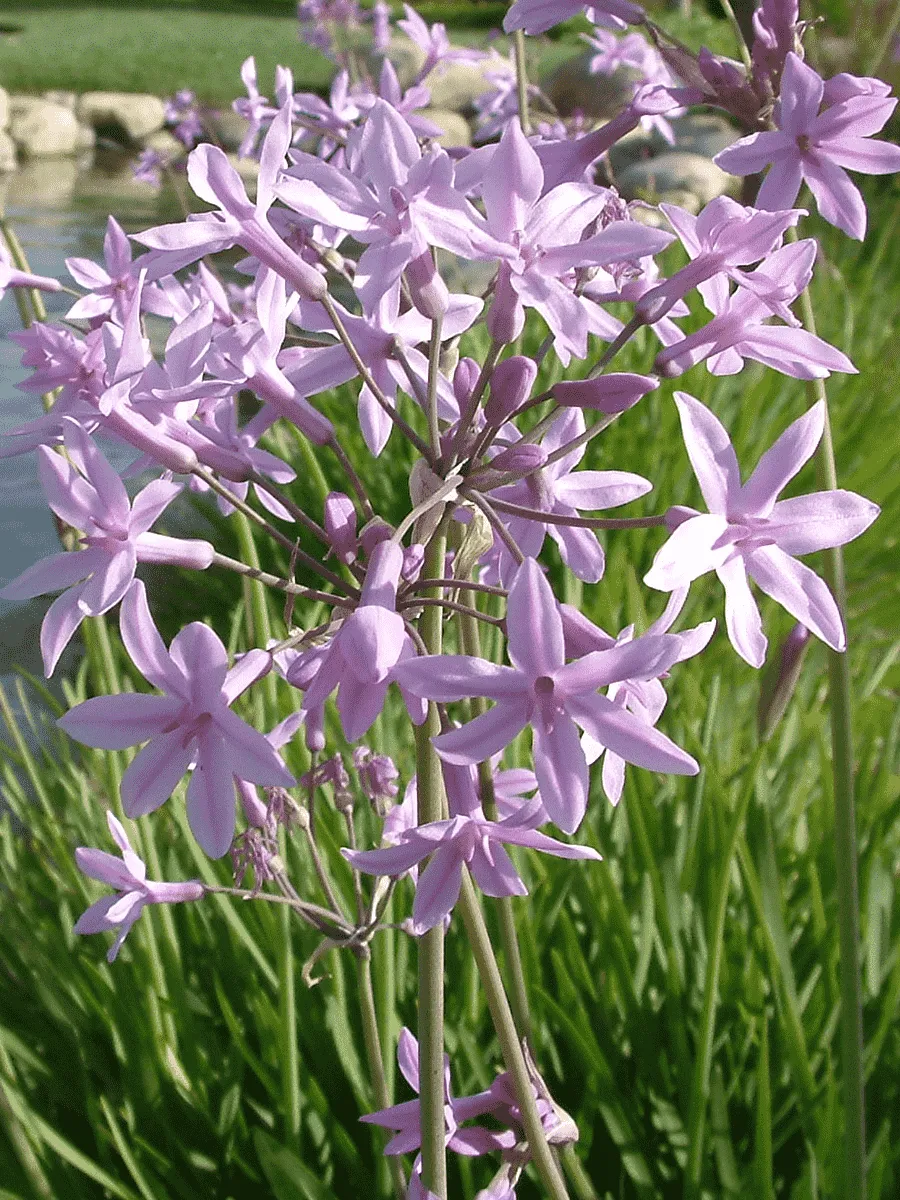 Тюльбагия Фиолетовая (Tulbaghia violacea), известная также как лиловый лук, пленяет взор нежностью своего облика и утончённостью аромата. Это многолетнее травянистое растение родом из Южной Африки обладает плотными зелёными листьями линейной формы, слегка мясистыми и покрытыми восковым налетом, придающим им благородную матовую поверхность. Листья собраны в прикорневую розетку, создавая живописный фон для эффектных соцветий. Цветки тюльбагии раскрываются небольшими зонтиками, состоящими из множества мелких трубчатых цветков нежно-фиолетового оттенка, украшенных белыми кончиками лепестков. Их аромат напоминает смесь ванили и мускуса, привлекающий внимание насекомых-опылителей. Растёт тюльбагия компактно, формируя аккуратные кустики высотой до полуметра, предпочитая солнечные места и хорошо дренированные почвы. Благодаря своей неприхотливости и декоративности она широко используется в ландшафтном дизайне, озеленении садов и городских пространств, радуя глаз своим изысканным видом и чарующим ароматом.