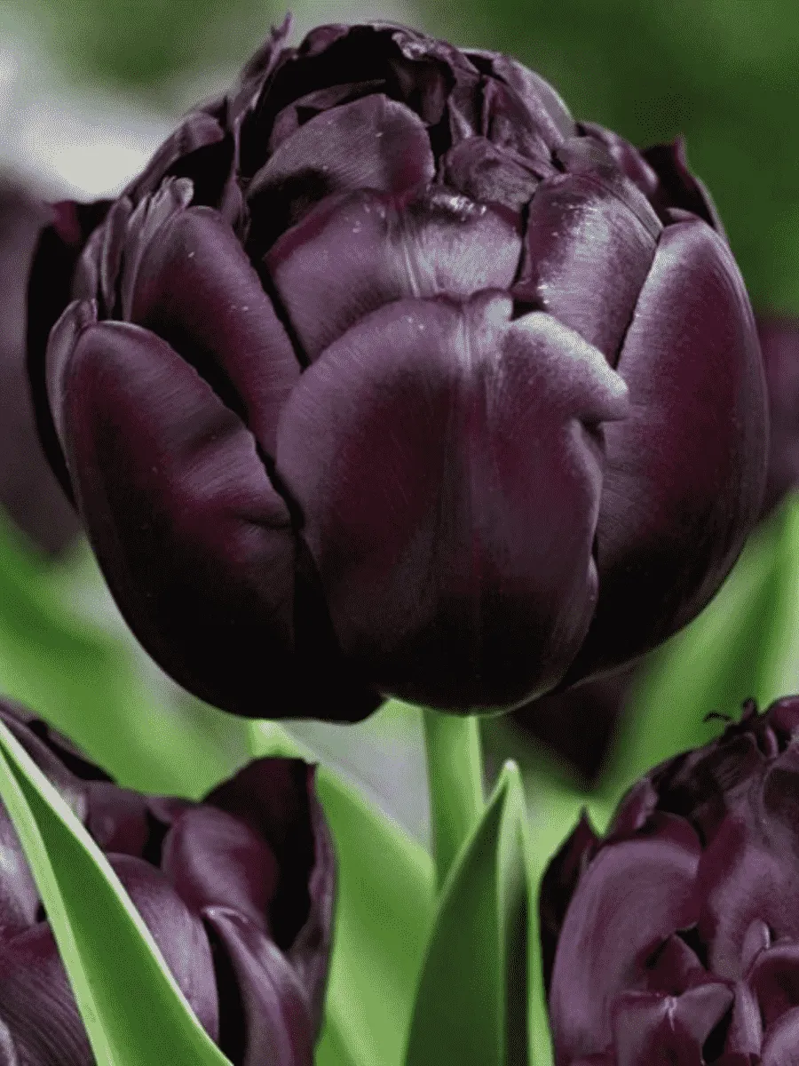 Тюльпан махровый *Black Hero* — роскошная садовая культура, поражающая своей элегантностью и благородством тёмной окраски. Листья удлинённые, гладкие, насыщенно-зелёные, слегка блестящие, подчёркивающие изысканность цветка. Бутоны крупные, округло-овальной формы, раскрываются постепенно, демонстрируя бархатистые лепестки глубокого чёрного цвета с едва уловимым фиолетовым отливом. Цветение продолжительное, начинается поздней весной и длится около двух недель, создавая эффектную композицию в саду. Растение предпочитает солнечные участки с плодородной почвой, устойчиво к холоду и ветрам, прекрасно адаптируется к различным климатическим условиям умеренной зоны. Высота стебля достигает 50–60 см, обеспечивая гармоничность композиции среди других растений. Этот тюльпан станет истинным украшением любого сада благодаря своему величественному облику и утончённой красоте.