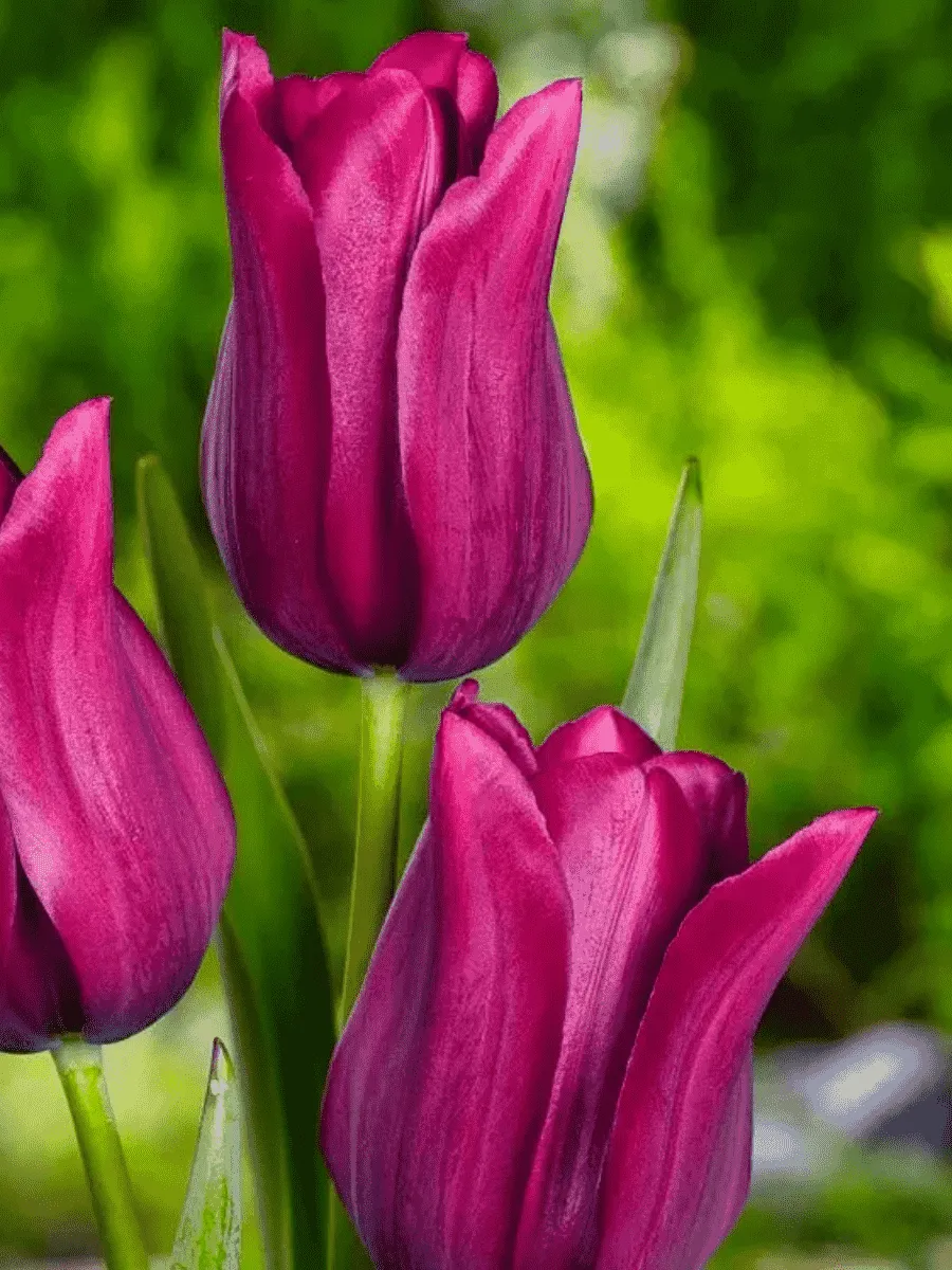 Тюльпан сорта *Merlot* пленяет взор изысканным благородством форм и оттенков, воплощённых природой в совершенстве. Его листья плотные, тёмно-зелёные, слегка блестящие, словно покрытые тонким слоем воскового блеска, подчёркивая элегантность облика. Цветки крупные, чашевидные, раскрываются постепенно, демонстрируя грациозную игру света и тени внутри лепестков. Окраска цветков насыщенно-вишнёвая, переходящая в рубиново-красный оттенок ближе к краям, создавая впечатление переливающегося вина Мерло, давшего название сорту. Бутоны возвышаются над листвой на крепких стеблях высотой около полуметра, сохраняя устойчивость даже после дождя. Период цветения приходится на апрель-май, когда тюльпаны распускают свои роскошные цветы, наполняя сад ароматом весны и очарованием утончённой красоты.