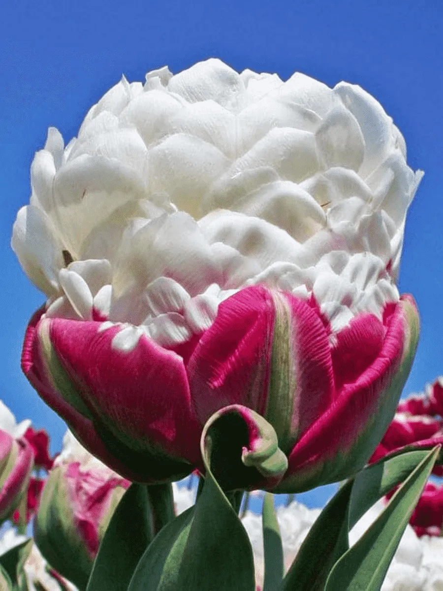 Тюльпан пионовидный Double Polar — изысканное растение семейства лилейных, покоряющее сердца садоводов своей роскошной красотой и нежностью цветения. Его крупные бутоны раскрываются пышными многослойными цветами, напоминающими распустившиеся розы или пионы, отчего сорт получил своё название. Лепестки нежно-розового оттенка плавно переходят от светлого основания к насыщенному краю, создавая впечатление лёгкого румянца на щеках красавицы. Листья тёмно-зелёные, гладкие, блестящие, слегка вытянутые и узколанцетные, подчёркивающие элегантность цветка. Высота стебля достигает 50–60 см, позволяя тюльпану уверенно возвышаться над весенними посадками. Цветёт обильно и продолжительно, начиная с конца апреля до середины мая, радуя глаз яркими красками и утончённым ароматом. Предпочитает солнечные места с плодородной рыхлой почвой, хорошо дренированной и умеренно увлажнённой. Сорт неприхотлив в уходе, устойчив к болезням и холоду, прекрасно размножается луковицами, легко адаптируясь к различным климатическим условиям умеренной зоны.