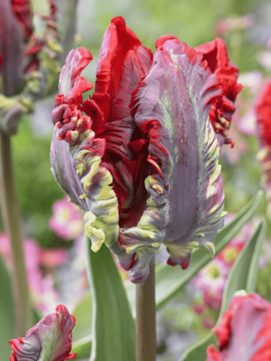 Тюльпан попугайный сорта *Rococo* пленяет взор своей изысканной красотой и необычной формой цветка. Листья удлинённые, гладкие, насыщенно-зелёного цвета, слегка блестящие, подчёркивающие элегантность стебля высотой до полуметра. Бутоны раскрываются крупными цветами диаметром около десяти сантиметров, лепестки которых словно вырезаны искусной рукой мастера: волнистые края, нежная бахрома и яркие переливы оттенков от тёмно-красного до оранжевого создают впечатление оперения экзотической птицы. Цветение начинается поздней весной, когда солнечные лучи уже достаточно тёплые, чтобы раскрыть всю прелесть этой удивительной культуры. Растёт тюльпан одиночно или небольшими группами, предпочитая плодородную почву и солнечное местоположение, распространяя вокруг себя атмосферу праздника весны и радости жизни.