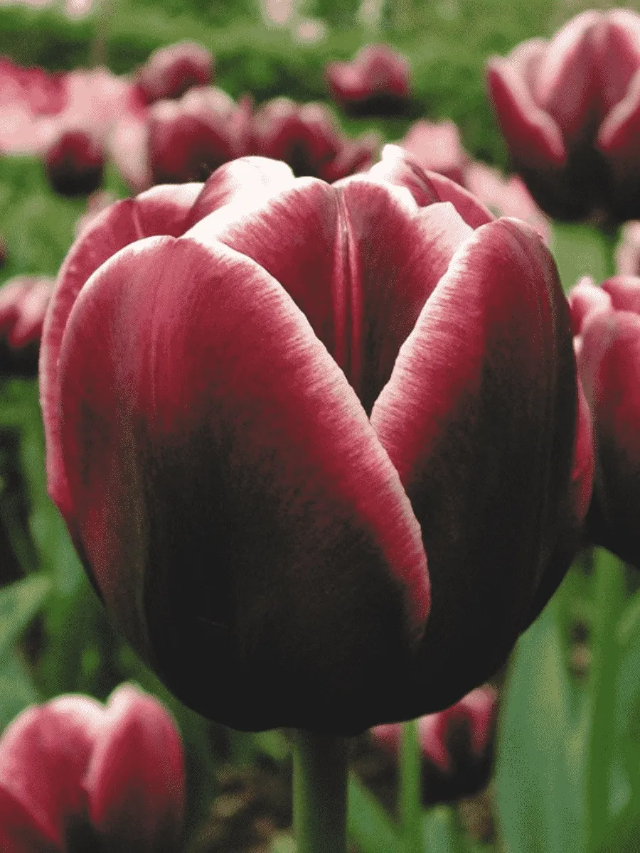 Тюльпан триумф Александр Пушкин — изысканное растение семейства лилейных, поражающее своей благородной красотой и утончённостью форм. Листья крупные, гладкие, насыщенно-зелёного цвета, слегка блестящие, придающие растению элегантность и свежесть облика. Цветки крупные, чашевидные, правильной формы, раскрываются широко и гордо возвышаются над листьями на крепких стеблях высотой до полуметра. Окраска цветков яркая, интенсивная, глубокого красного оттенка с едва заметным пурпурным отливом, словно отражающим пламя заката. Бутоны появляются рано весной, радуют глаз своим великолепием около двух недель, постепенно сменяя нежную бархатистость лепестков лёгкой прозрачностью увядания. Растёт тюльпан преимущественно на солнечных участках, предпочитая плодородные почвы и умеренный полив, распространяясь благодаря луковицам, ежегодно формирующим новые дочерние образования.