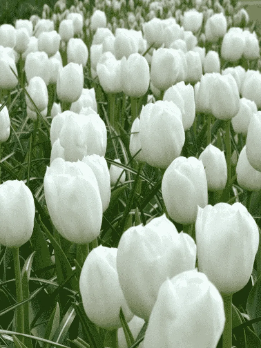 Тюльпан триумф Royal Virgin — изысканное растение семейства лилейных, покоряющее своей благородной простотой и утончённой элегантностью. Листья длинные, гладкие, насыщенно-зелёного цвета, слегка блестящие, придающие растению стройность и лёгкость. Цветки крупные, правильной формы, чашевидные, раскрываются широко, демонстрируя нежную белоснежную поверхность лепестков с едва заметным кремовым оттенком внутри. Бутоны появляются рано весной, возвышаясь над зелёным ковром листьев на крепких прямостоячих стеблях высотой около сорока сантиметров. Период цветения продолжительный, радуя глаз чистотой оттенков и свежестью аромата. Растёт преимущественно в садах и парках умеренного климата, предпочитая солнечные участки с плодородной почвой, где легко размножается луковицами, ежегодно обновляя свою красоту и очарование.
