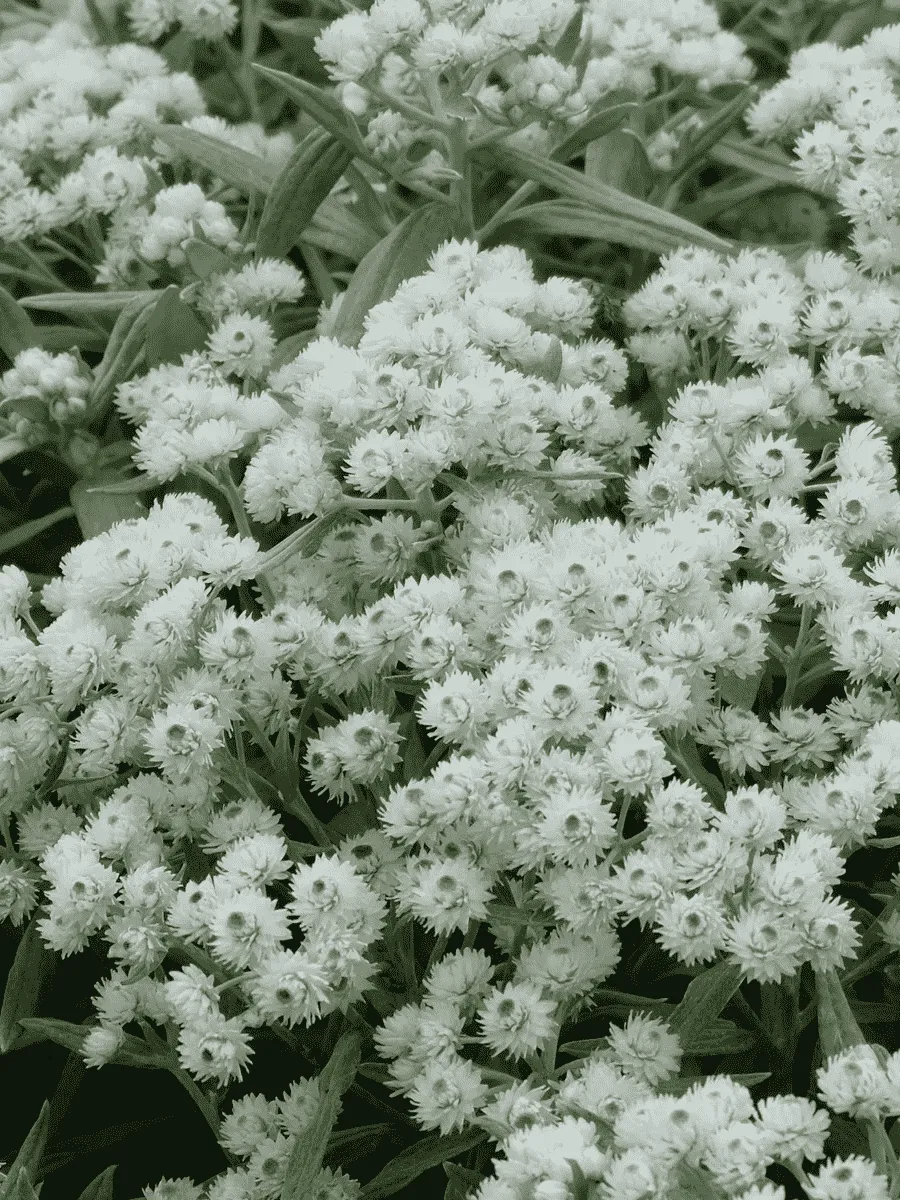 Анафалис трёхжилковый (*Anaphalis triplinervis*) — многолетнее травянистое растение семейства астровых (Asteraceae), покорившее сердца садоводов своей изысканной красотой и неприхотливостью. Стройные прямостоячие стебли высотой до полуметра украшены узкими серебристо-серыми листьями, покрытыми нежным пушком, придающим растению воздушность и лёгкость. Листья линейной формы, слегка загнутые книзу, создают впечатление тонких перьев, трепещущих от малейшего дуновения ветра. Цветёт анафалис пышными белыми соцветиями-корзинками диаметром около сантиметра, собранными в густые щитковидные метёлки, словно снежинки, застывшие на ветру. Его белоснежная шапка цветков долго сохраняет свежесть и декоративность даже после увядания лепестков, превращаясь в сухоцвет, идеально подходящий для зимних букетов и композиций. Растение предпочитает солнечные места, хорошо дренированные почвы и легко переносит засуху, распространяясь преимущественно в горных районах Азии, где оно украшает альпийские луга и каменистые склоны, создавая живописную картину среди сурового горного пейзажа.