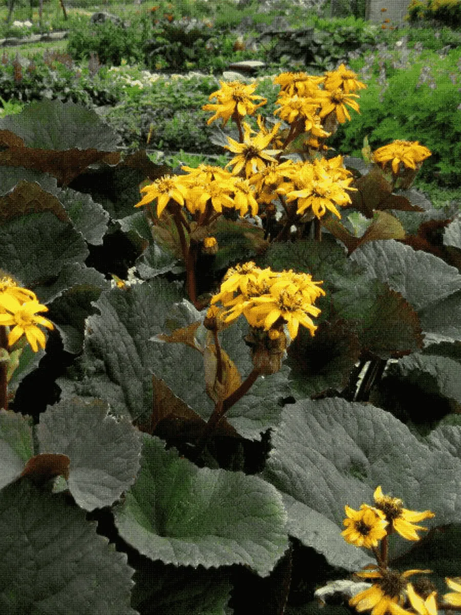 Бузульник зубчатый сорта *Dark Beauty* — эффектная многолетняя культура, поражающая своей величественной красотой и благородством форм. Мощные прямостоячие стебли достигают высоты до полутора метров, увенчанные крупными листьями насыщенного тёмно-зелёного цвета с глубокими прожилками пурпурного оттенка, придающими растению особую декоративность даже вне периода цветения. Листья крупные, пальчато-рассечённые, слегка волнистые по краям, словно вырезаны искусной рукой мастера. Цветки собраны в пышные метельчатые соцветия лимонно-жёлтого тона, возвышающиеся над листвой подобно ярким факелам, освещающим садовые композиции с конца июня до середины сентября. Растение предпочитает влажные плодородные почвы и полутень, прекрасно дополняя берега водоёмов, тенистые уголки сада и миксбордеры, где оно раскрывается во всей красе, создавая атмосферу таинственности и гармонии природы.