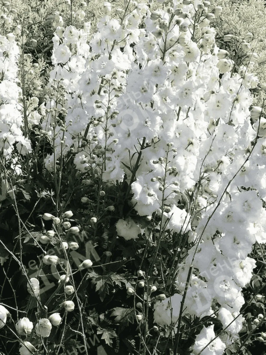 Дельфиниум сорта *Magic Fountain Pure White* пленяет взор своей утончённой красотой и благородством форм. Это многолетнее травянистое растение достигает высоты до полутора метров, обладая прямостоячими крепкими стеблями, покрытыми нежной бархатистостью. Листья крупные, пальчато-раздельные, тёмно-зелёного оттенка, слегка блестящие, придают растению особую декоративность даже вне периода цветения. Но истинную прелесть дельфиниума раскрывают многочисленные соцветия-пирамиды, состоящие из множества мелких цветков идеальной формы, словно вырезанных искусным мастером. Цветки белоснежные, чистые и яркие, создают впечатление воздушности и лёгкости, будто сотканные из утренней росы. Период цветения продолжительный, начинается в июне и длится до конца июля, украшая сад изысканным белым облаком, притягивающим взгляд и дарящим ощущение свежести и чистоты. Растёт быстро, предпочитает солнечные места и плодородные почвы, легко размножается семенами и делением куста, становясь украшением любого сада благодаря своему величественному облику и элегантному внешнему виду.