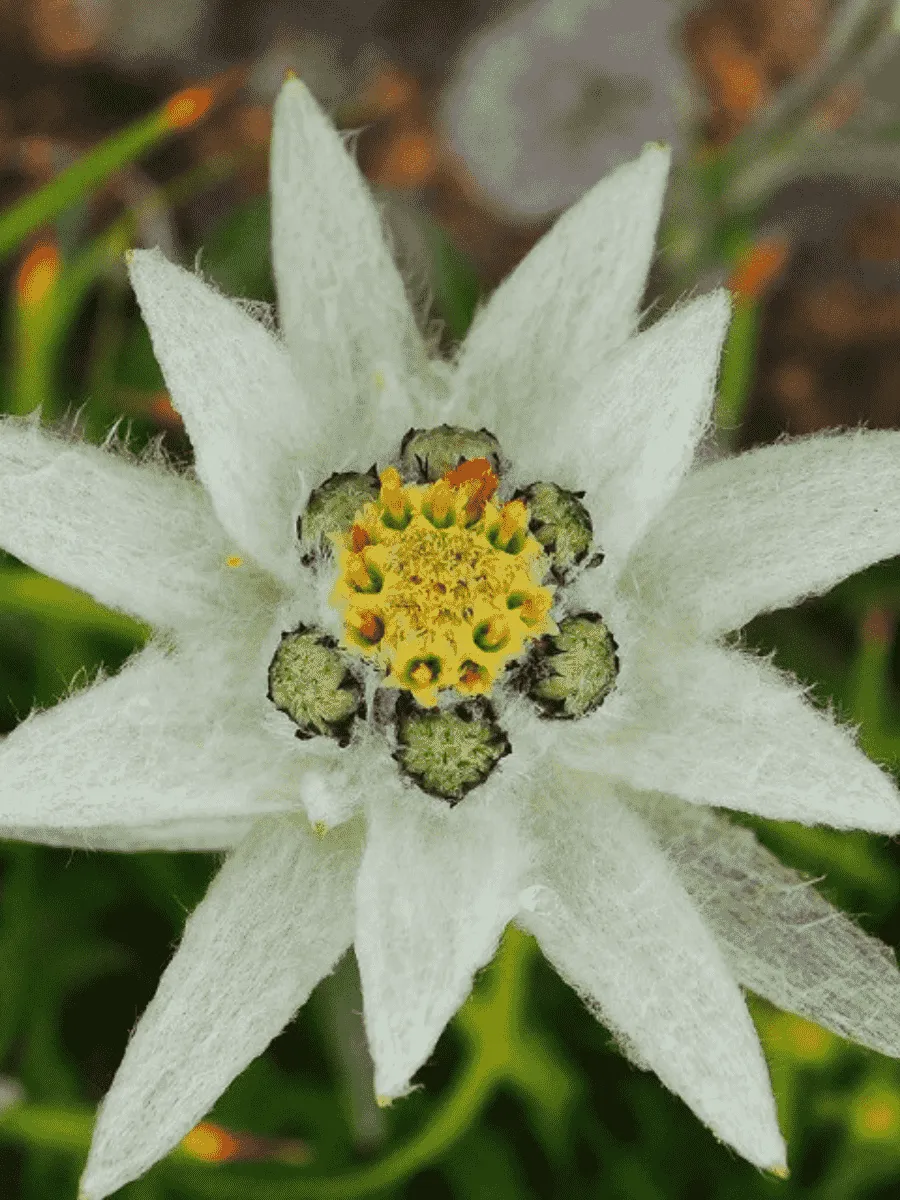 Эдельвейс Souliei (Leontopodium souliei), этот гордый обитатель альпийских лугов, пленяет взор своей изысканной красотой и благородством облика. Стебли тонкие, покрытые нежной серебристо-войлочной опушкой, поднимаются над землей на высоту до 15 см, увенчанные компактными розетками узких линейных листочков серовато-зелёного оттенка, словно облачённых в мягкий пушистый покров. Цветки мелкие, жёлтовато-белые, собраны в плотные корзинки, окружённые многочисленными белыми лучистыми листьями-обёртками, придающими соцветиям характерную звёздчатую форму и воздушность. Растёт небольшими группами среди камней и скал, предпочитая сухие каменистые почвы высокогорья, где царит прохлада и чистота горных ветров. Этот символ стойкости и чистоты очаровывает своим скромным величием и неподражаемой грацией, воплощая собой дух суровых вершин и вдохновляя поэтов и художников уже многие века.