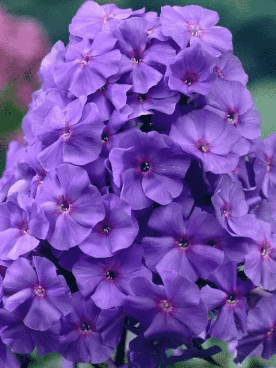 Флокс метельчатый сорта *Amethyst* пленяет взор роскошной кроной густых зелёных стеблей, украшенных нежнейшими ланцетными листьями насыщенного изумрудного оттенка, словно сотканными из утреннего света. Его пышная шапка соцветий состоит из множества мелких цветков, собранных в крупные рыхлые кисти, возвышающихся над листвой подобно сказочным свечкам. Цветки обладают глубоким фиолетово-сиреневым оттенком, переливающимся всеми градациями аметистового цвета от светлых до тёмных тонов, создавая впечатление драгоценности среди зелени сада. Высота взрослого растения достигает полуметра, оно отличается быстрым ростом и способностью формировать плотную куртину, идеально подходящую для украшения бордюров, миксбордеров и клумб. Период цветения продолжительный, начинается в июне и длится вплоть до конца августа, наполняя сад чарующим ароматом и привлекая внимание бабочек и пчёл своей изысканной красотой.