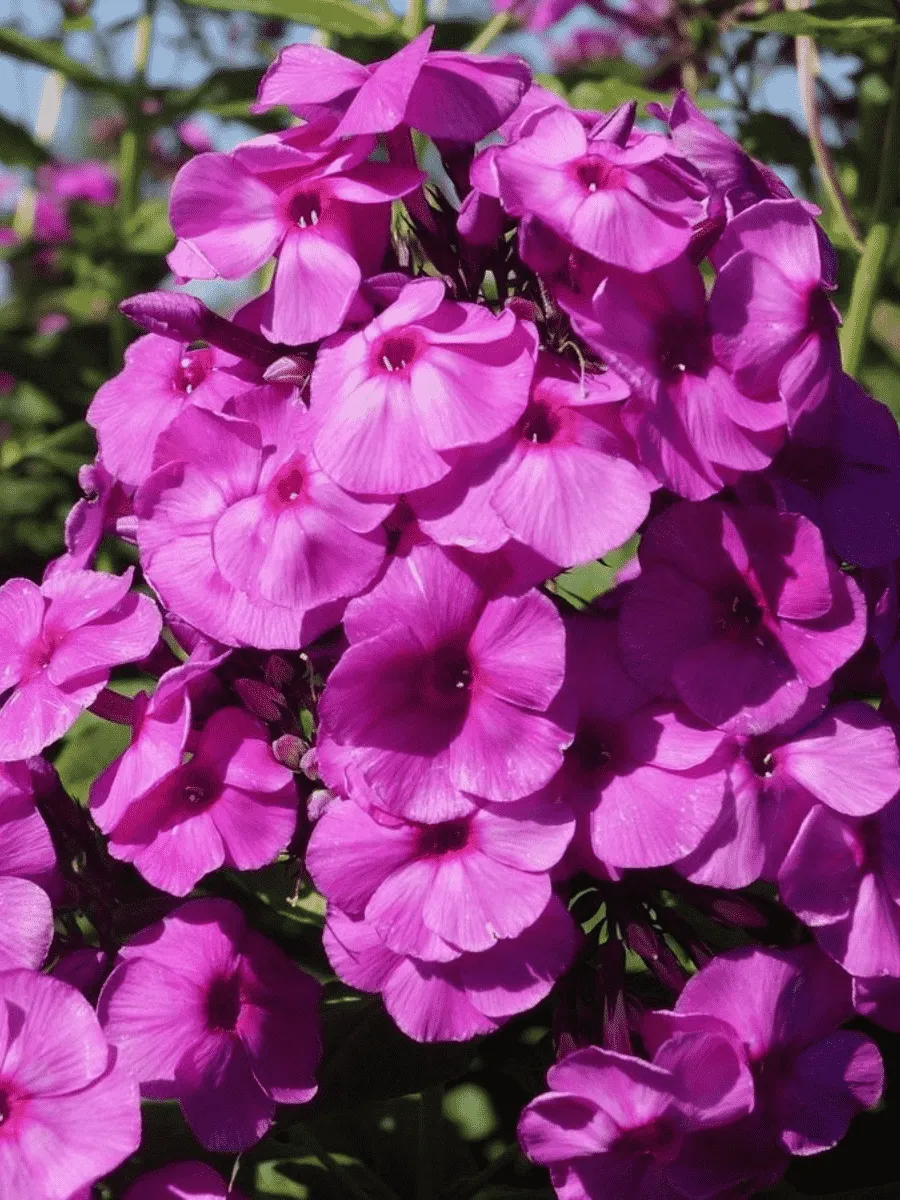 Флокс метельчатый сорта *Younique Purple* пленяет взор роскошной кроной густых темно-зеленых листьев овальной формы с легким блеском, словно покрытых тонким слоем воскового сияния. Его побеги устремляются вверх стройными колоннами высотой до метра, создавая пышную пирамиду соцветий, состоящую из множества мелких трубчатых цветков насыщенного пурпурного оттенка, украшенных едва заметным серебристым напылением. Цветение начинается в июне и продолжается вплоть до сентября, постепенно раскрываясь от нижних ветвей к верхним, будто волна фиолетово-сиреневого цвета поднимается снизу вверх, превращая растение в живописный букет, привлекающий внимание своей изысканной красотой и нежностью аромата. Этот сорт отличается устойчивостью к болезням и неприхотливостью в уходе, прекрасно адаптируясь к различным условиям выращивания и радуя садоводов своим долгим и ярким цветением.