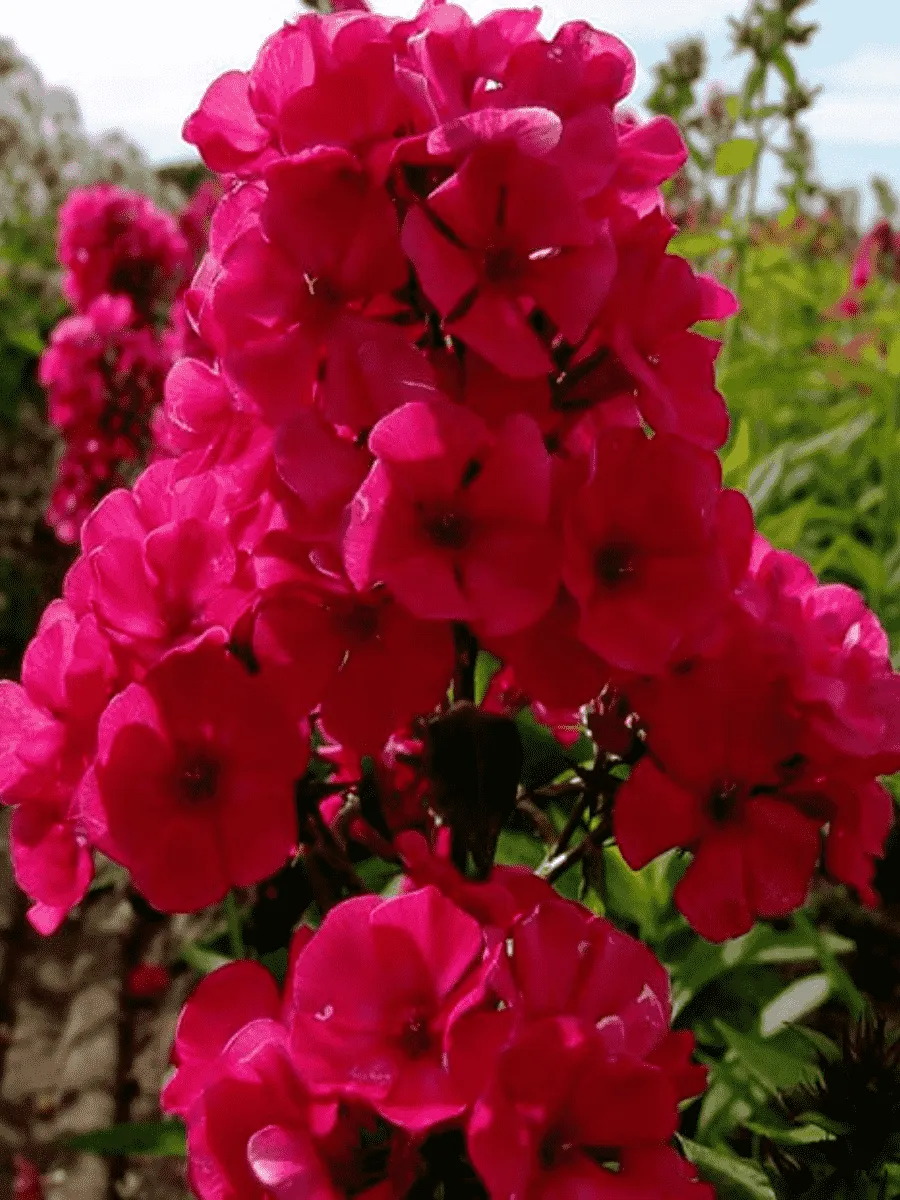 Флокс метельчатый сорта *Younique Red* пленяет взор роскошной кроной густых темно-зеленых листьев овальной формы с легким блеском, словно покрытых тонким слоем воскового сияния. Его побеги устремляются вверх стройными колоннами высотой до полутора метров, создавая пышную пирамидальную композицию. Цветки собраны в крупные плотные соцветия-метёлки диаметром около двадцати сантиметров, состоящие из множества трубчатых цветков насыщенного рубинового оттенка, переливающихся глубокими бархатисто-красными полутонами. Аромат цветов тонкий, едва уловимый, придающий саду особую атмосферу изысканности и утончённости. Период цветения продолжительный, начинается в июне и длится вплоть до сентября, украшая сад яркими красками даже в пасмурные дни. Растение неприхотливо, предпочитает солнечные места и плодородные почвы, легко размножается черенкованием и делением куста, быстро разрастаясь и заполняя пространство живописными красочными островками.
