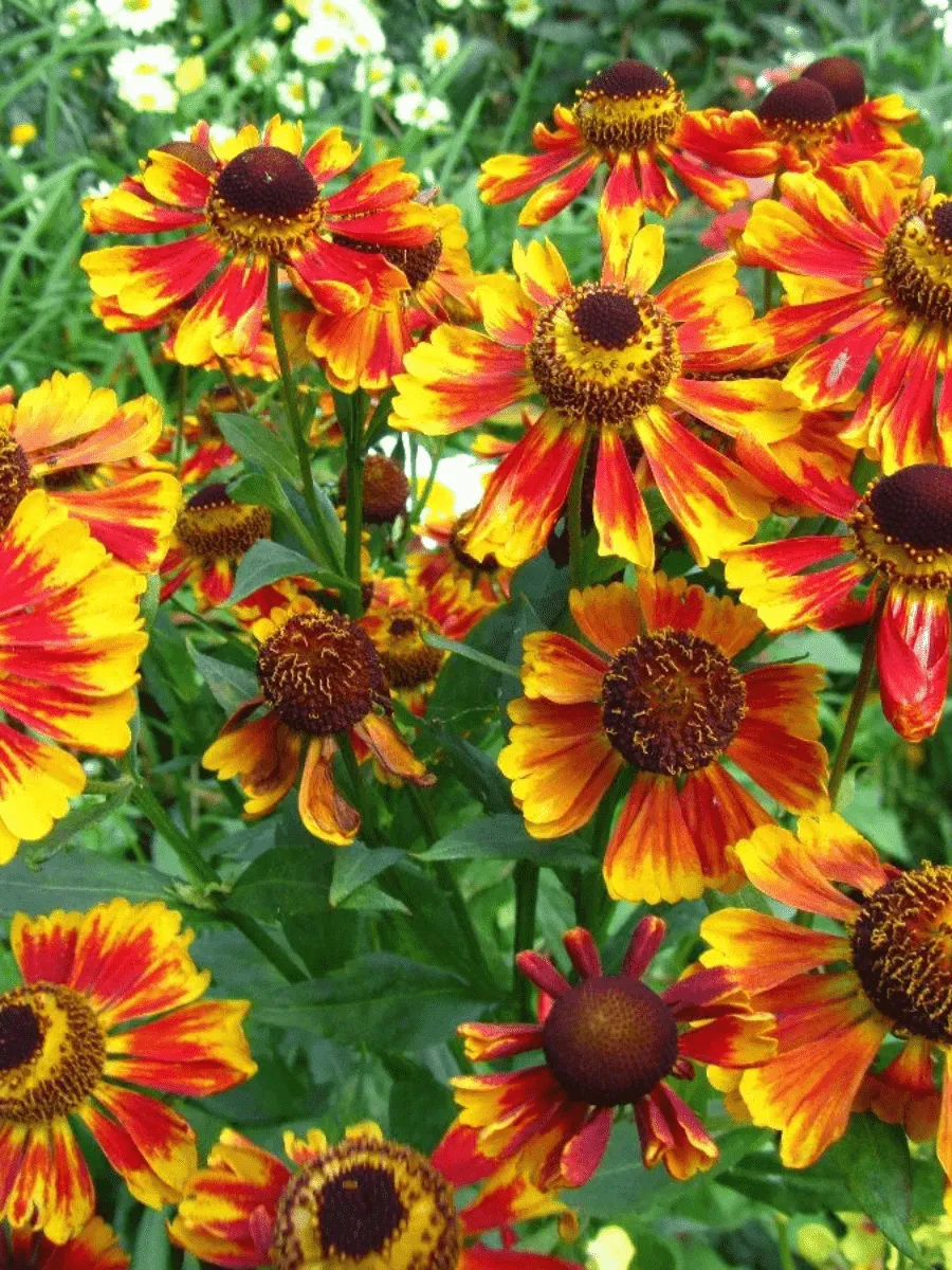 Гелениум сорта *Feuersiegel* очаровывает взор яркими красками осеннего сада, словно запечатлевая последние солнечные дни года. Это многолетнее растение достигает высоты от 60 до 100 см, обладая крепкими прямостоячими стеблями, покрытыми крупными овально-ланцетными листьями насыщенного зелёного цвета с лёгким блеском. Цветки гелениума представляют собой крупные корзинки диаметром около 5–7 см, состоящие из множества мелких трубчатых цветков золотисто-жёлтого оттенка, окружённых длинными язычковыми лепестками огненно-красной окраски, плавно переходящей в жёлтые тона ближе к центру соцветия. Такое сочетание цветов создаёт впечатление пламенных всполохов среди зелени, оправдывая название сорта («Печать огня»). Период цветения начинается в августе и продолжается вплоть до октября, украшая сад своей живописностью даже после первых заморозков. Гелениум предпочитает плодородную почву и солнечное местоположение, устойчив к засухе и холоду, легко размножается делением корневища и прекрасно подходит для групповых посадок, миксбордеров и срезочных композиций.