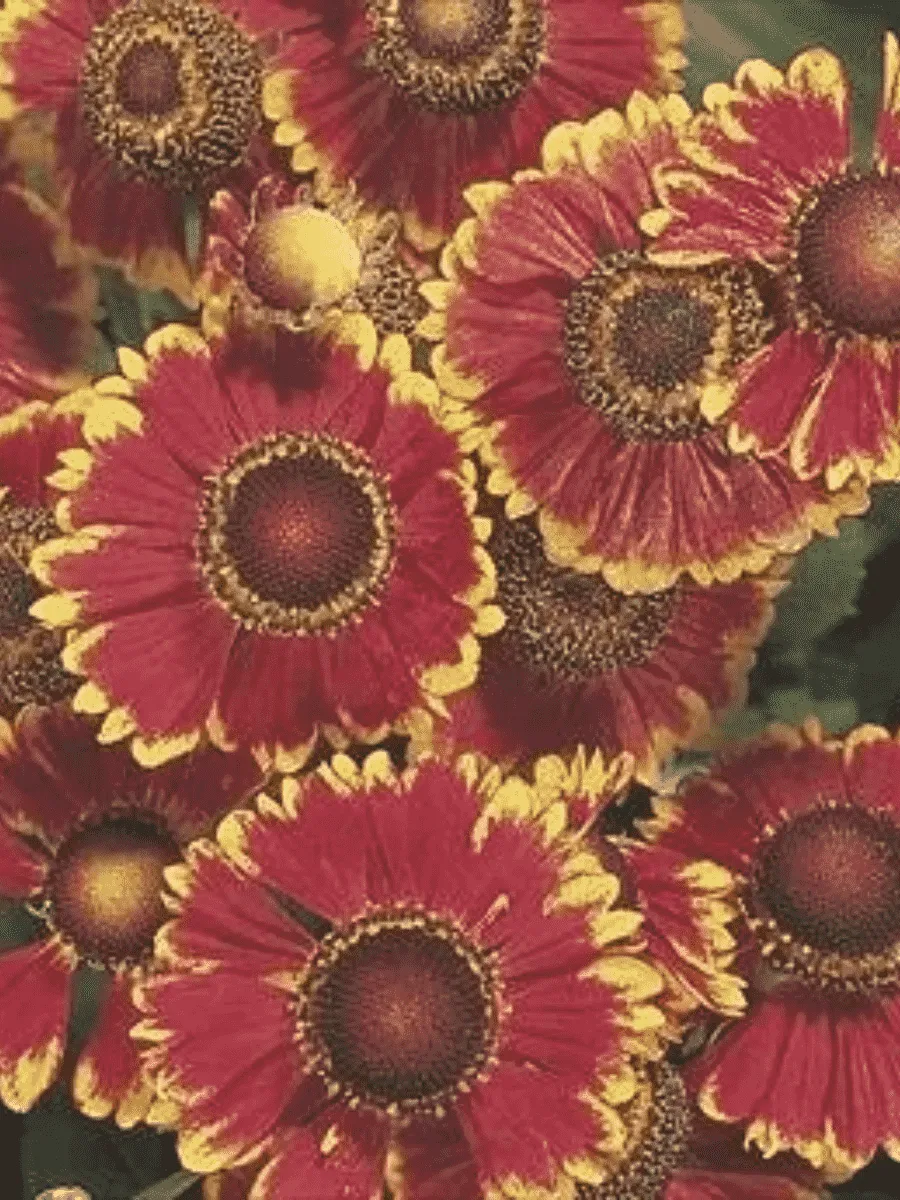 Гелениум осенний сорта *Helena Red Shades* — роскошная многолетняя культура, поражающая своей живописностью и благородством форм. Стройные прямостоячие стебли высотой до полутора метров украшены крупными листьями насыщенного зелёного оттенка, слегка шероховатыми на ощупь и придающими растению особую декоративность даже вне периода цветения. Цветёт гелениум поздним летом и осенью, раскрывая крупные корзинки соцветий диаметром около восьми сантиметров, состоящие из множества мелких трубчатых цветков золотисто-жёлтого цвета, окружённых яркими язычковыми лепестками оттенков от тёмно-красного до пурпурного, плавно переходящими в бордовый и коричневатый тона ближе к центру цветка. Эти грациозные цветы словно вспыхивают ярким пламенем среди увядающей зелени сада, придавая участку особое очарование и завершённость композиции. Растение предпочитает солнечные места, хорошо дренированные почвы средней плодородности и умеренный полив, прекрасно размножается делением корневища и семенами, легко адаптируется к различным климатическим условиям и широко используется в ландшафтном дизайне благодаря своему эффектному внешнему виду и продолжительному периоду цветения.