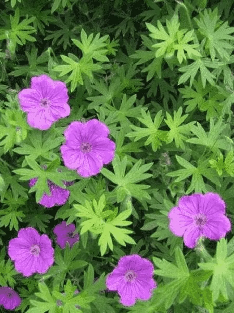 Герань кроваво-красная Tiny Monster — миниатюрное травянистое растение с компактной формой куста и густым ветвлением, достигающее всего лишь 15–20 см высоты. Листья округло-пятиугольные, глубоко рассечённые на узколанцетные сегменты, покрыты нежным пушком и окрашены в насыщенный тёмно-зелёный оттенок с пурпурным отливом, особенно заметным осенью. Цветки собраны в плотные зонтики, возвышающиеся над листвой, каждый цветок обладает пятью лепестками глубокого алого цвета, словно капли свежей крови, контрастирующими с золотистыми тычинками. Период цветения продолжительный, начинается в июне и продолжается до поздней осени, наполняя сад яркими красками даже после увядания большинства растений. Предпочитает солнечные места и плодородную почву, легко размножается семенами и черенкованием, быстро формируя живописные группы и бордюры.
