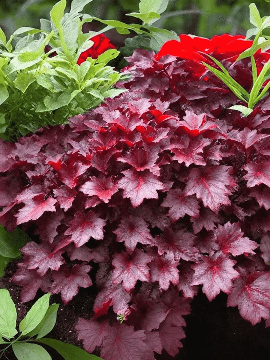 Гейхера сорта *Berry Marmalade* пленяет взор изысканной игрой красок и элегантностью форм. Листья её крупные, сердцевидные, рассечённые по краям, словно вырезанные искусной рукой мастера, переливаются оттенками от насыщенно-бордового до тёмно-пурпурного цвета, создавая впечатление драгоценного бархата, освещённого лучами солнца. Весной и летом растение покрывается нежными кистями мелких цветков кремово-розовых оттенков, возвышающихся над листвой на тонких прочных стеблях, будто миниатюрные свечи, мерцающие среди густого ковра зелени. Культура предпочитает полутень и умеренно влажную почву, прекрасно адаптируется к различным условиям произрастания, украшая сады и парки своей живописной декоративностью круглый год.