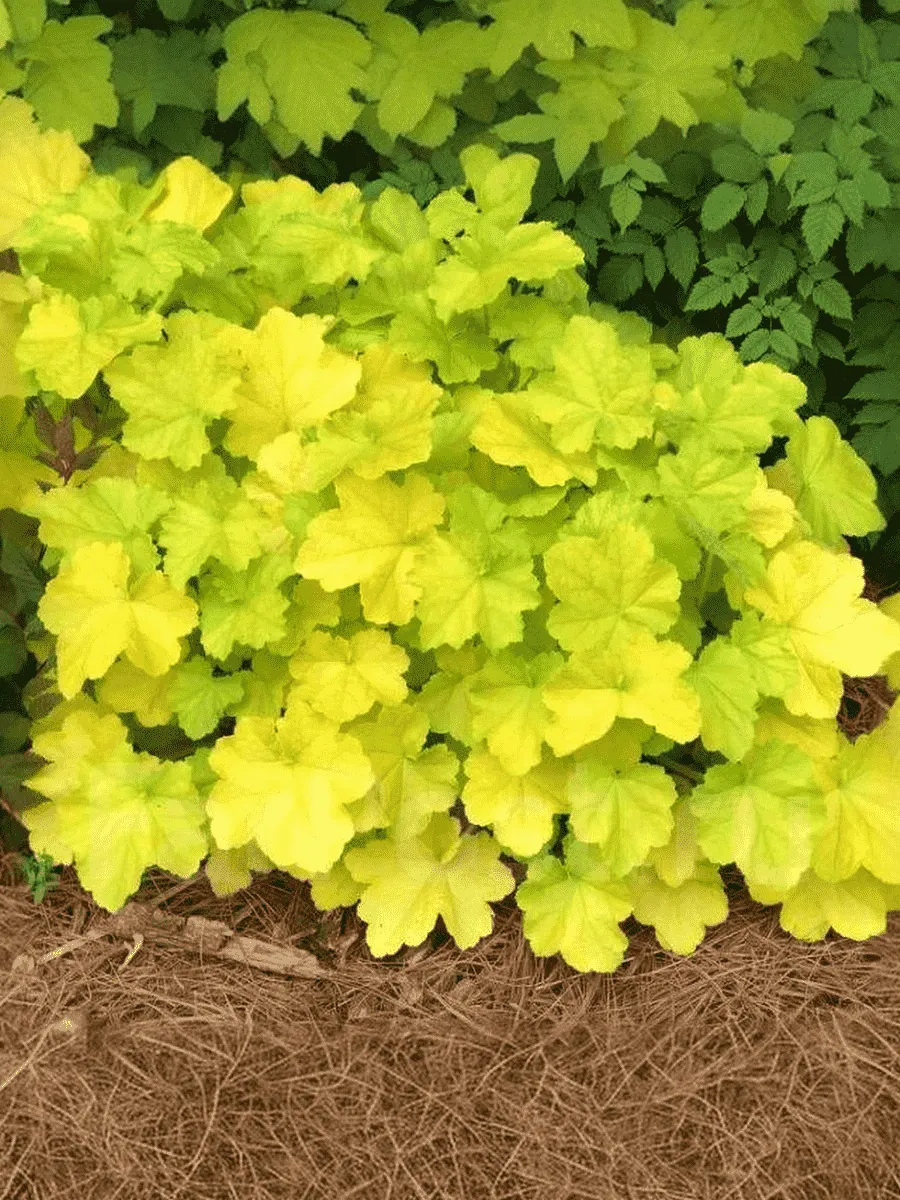 Гейхера сорта *Lemon Dinosaur* пленяет взор своей изысканной декоративностью и необычностью облика. Листья крупные, глубоко рассечённые, словно вырезанные искусной рукой мастера, напоминают причудливые узоры древних динозавров, от которых растение и получило своё название. Их изумрудная зелень летом постепенно сменяется нежнейшими лимонно-жёлтыми оттенками, создавая эффектную игру цвета и света. Цветки гейхеры мелкие, собраны в рыхлые метельчатые соцветия нежно-розового оттенка, возвышающиеся над листвой на стройных стеблях высотой до полуметра. Растёт гейхера медленно, формируя компактные кустики диаметром около 45 см, предпочитая полутень и умеренно влажные почвы. Этот сорт прекрасно подходит для оформления тенистых садов, рокариев и миксбордеров, привнося в ландшафт неповторимую экзотичность и утончённую красоту.