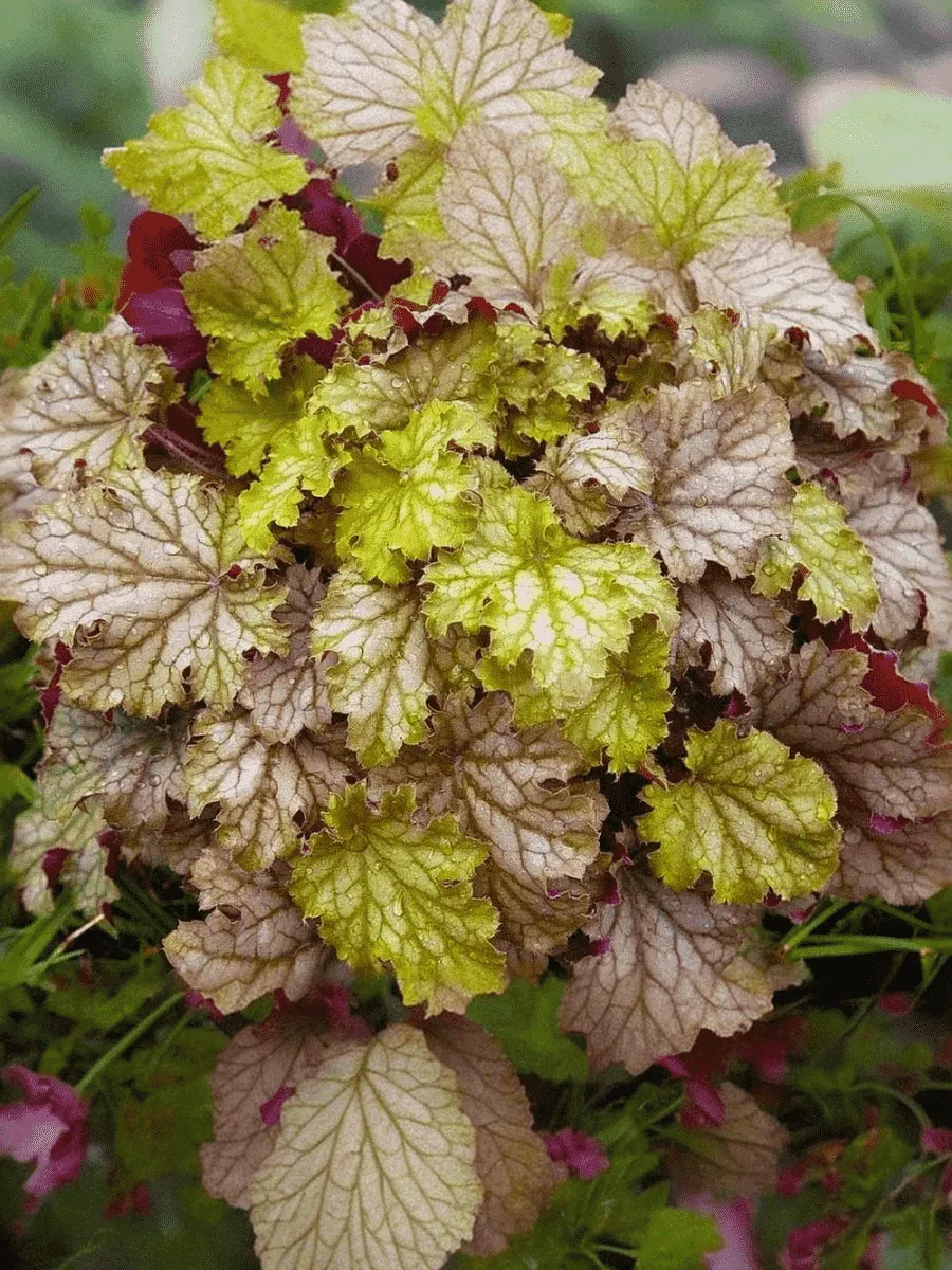 Гейхера **World Café Amaretto** пленяет взор изысканным сочетанием благородной окраски и утончённой формы листвы. Листья крупные, сердцевидные, рассечённые по краям, словно искусная резьба мастера, переливаются оттенками от тёмно-коричневого до шоколадно-красного цвета, создавая впечатление бархатного полотна, покрытого тонким слоем амаретто. По мере взросления листья приобретают насыщенный бронзово-бордовый оттенок, подчёркивая элегантность и аристократизм сорта. Цветки гейхеры собраны в рыхлые метельчатые соцветия нежно-розового оттенка, возвышающиеся над листьями на стройных прочных стеблях высотой около полуметра. Растение предпочитает полутень и умеренно влажную почву, прекрасно адаптируется к различным условиям произрастания, демонстрируя свою неприхотливость и устойчивость к неблагоприятным факторам среды. Благодаря своей декоративности и длительному периоду цветения, гейхера World Café Amaretto становится украшением любого сада, привнося атмосферу гармонии и природной красоты.