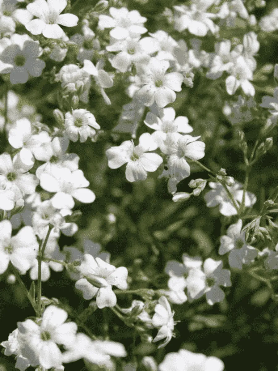 Гипсофила ползучая сорта *Filou White* — нежная травянистая красавица с тонкими серебристо-зелёными листьями, словно кружевной покров покрывающими почву тонким ковром. Её миниатюрные стебли стелются вдоль поверхности земли, создавая живописную композицию из мелких веточек и крошечных листочков, похожих на игривые перышки. Цветёт растение очаровательными белыми цветами, собранными в рыхлые зонтичные соцветия, будто снежинки, застывшие среди зелени. Эти воздушные цветки придают ландшафту особую воздушность и лёгкость, наполняя пространство утончённой белизной и свежестью. Растение предпочитает солнечные места, легко адаптируется к различным почвенным условиям и отличается устойчивостью к засухе, превращаясь в идеальное украшение альпийских горок, рокариев и бордюров.