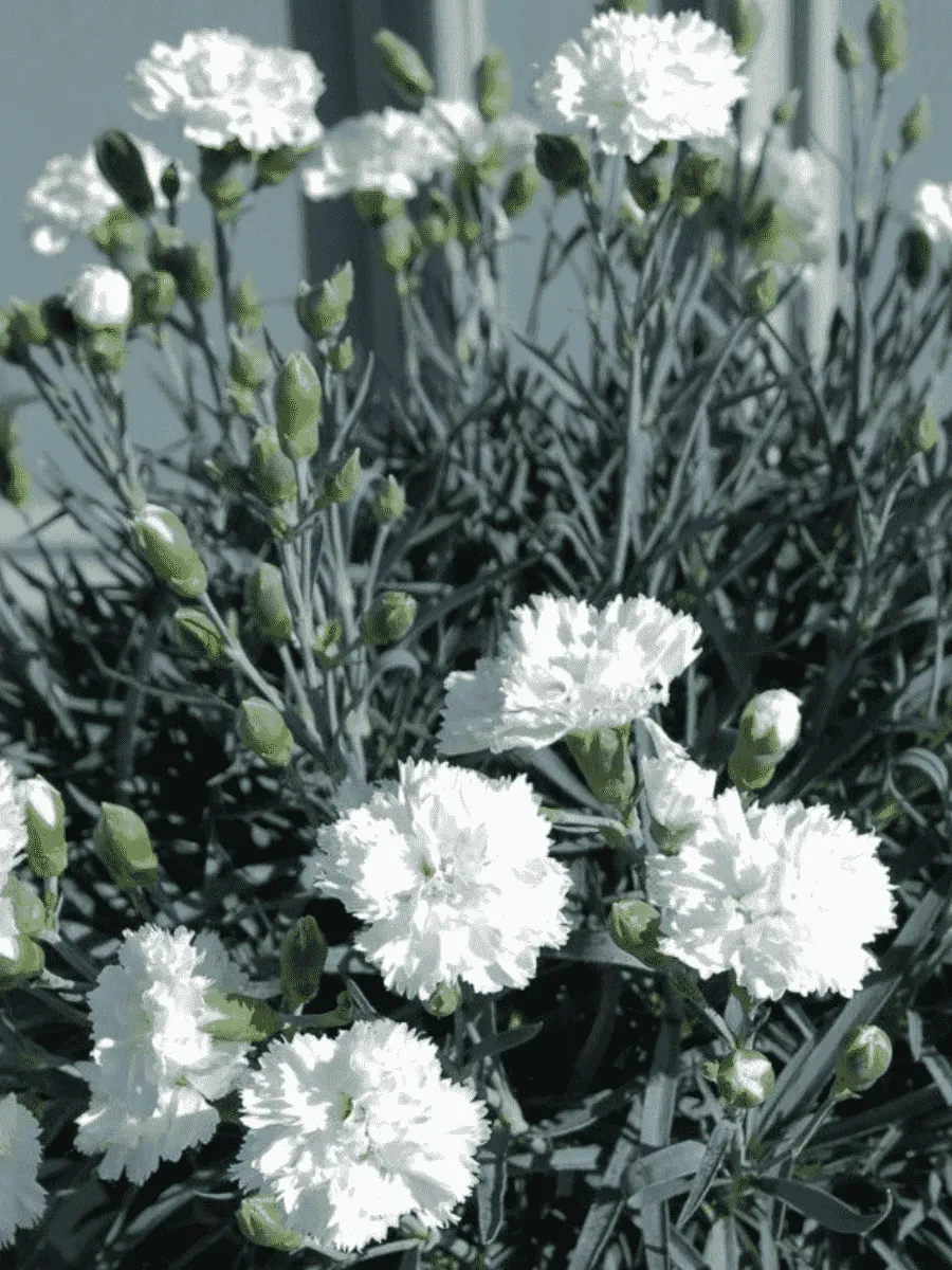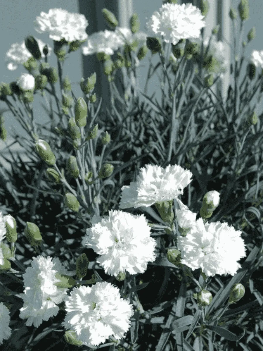 Гвоздика перистая сорта *Haytor White* пленяет взор своей утончённой красотой и нежностью форм. Это многолетнее травянистое растение образует компактную розетку узких серебристо-серых листочков, словно выточенных тонкой кистью мастера. Листья тонкие, линейные, слегка волнистые по краям, придают растению воздушность и лёгкость. Цветки собраны в рыхлые соцветия, возвышающиеся над листвой на тонких стеблях высотой до полуметра. Лепестки цветков белые, полупрозрачные, будто сотканные из утренней дымки, с едва заметной сеточкой тоненьких прожилок, придающих особую изысканность. Бутоны раскрываются постепенно, наполняя сад тонким ароматом свежести и чистоты. Растёт гвоздика медленно, предпочитая солнечные места и хорошо дренированные почвы, создавая живописные островки среди каменистых садов и альпийских горок.