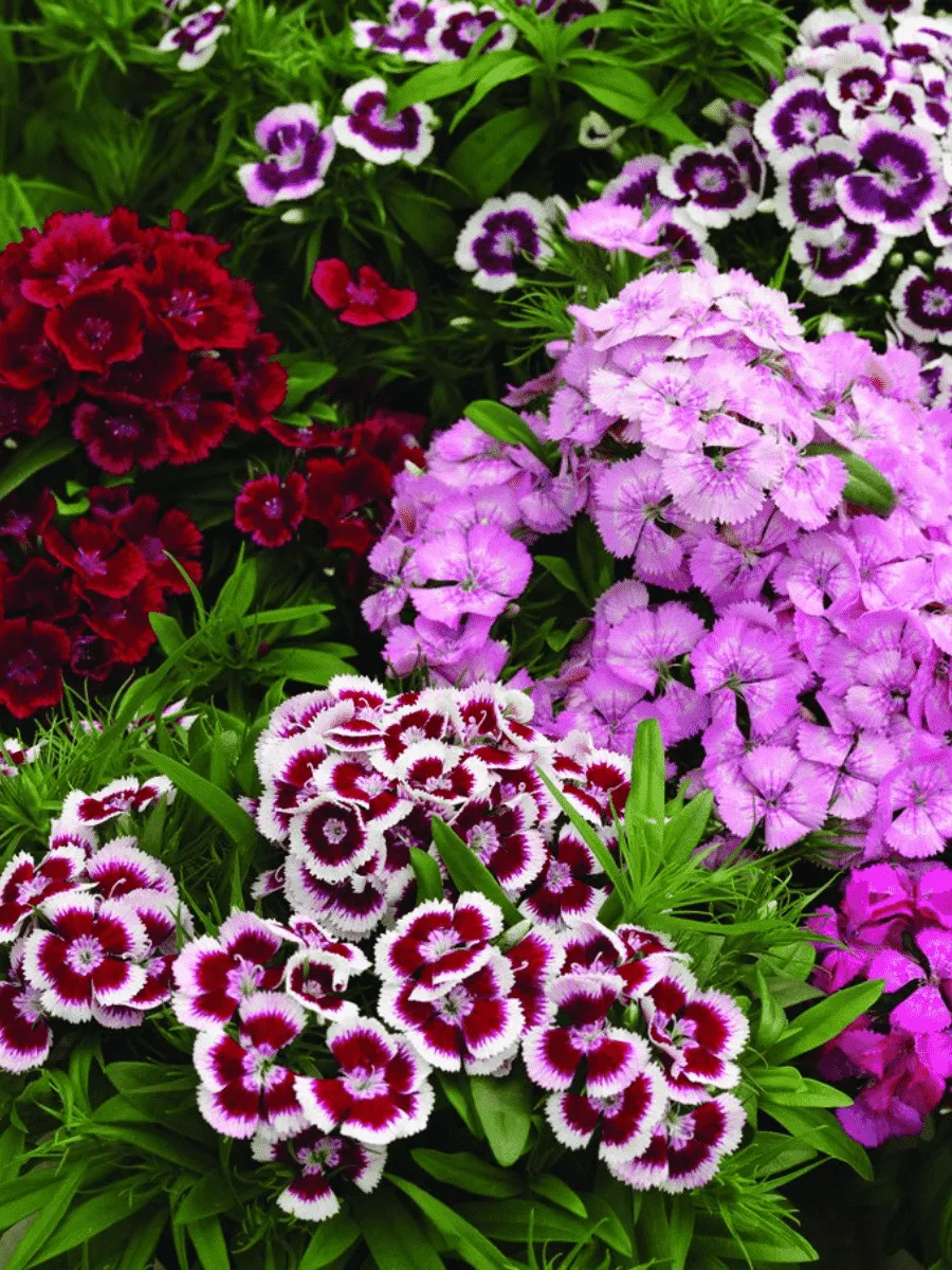 Гвоздика турецкая *Diabunda Formula Mix* пленяет взор своей изысканной красотой и многообразием оттенков. Это многолетнее растение образует компактные кустики высотой до полуметра, украшенные узкими линейными листьями насыщенного зелёного цвета, придающими растению особую элегантность. Цветки гвоздики собраны в пышные соцветия, состоящие из множества махровых цветков разнообразной окраски — от нежнейших пастельных тонов до ярких пурпурных и алых оттенков. Бутоны раскрываются постепенно, создавая эффект непрерывного цветения, которое длится несколько недель, наполняя сад тонким ароматом и радуя глаз живописностью форм и красок. Предпочитает солнечные места и плодородную почву, легко размножается семенами и черенкованием, быстро разрастаясь и заполняя пространство яркими красками летнего сада.