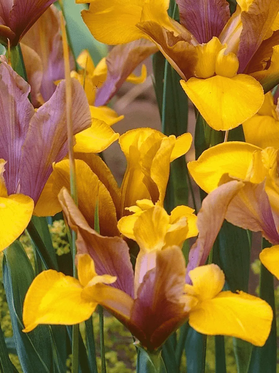 Ирис Bronze Queen — изысканное растение семейства касатиковых (Iridaceae), покоряет сердца садоводов своей благородной красотой и утончённостью форм. Листья узколинейные, слегка дугообразно изгибающиеся, словно зелёная волна, плавно переходящая от основания к кончикам, окрашены в насыщенный тёмно-зелёный оттенок с едва заметным бронзовым отблеском, придающим особую элегантность облику цветка. Цветки крупные, диаметром около 15 см, распускаются поздней весной—ранним летом, демонстрируя роскошную палитру оттенков: внешние доли венчика бархатисто-тёмно-пурпурные с золотистым переливом, внутренние же — нежно-фиолетовые с серебристым напылением, контрастирующие с ярко-жёлтыми бородками, расположенными вдоль центральной жилки каждого лепестка. Корневище мощное, горизонтально разрастающееся, способствующее быстрому формированию плотных кустов высотой до полуметра. Предпочитает солнечные участки с плодородной почвой умеренной влажности, устойчив к холоду и засухе, прекрасно адаптируется к различным климатическим условиям средней полосы России, украшая сады и парки своим величественным присутствием долгие годы.