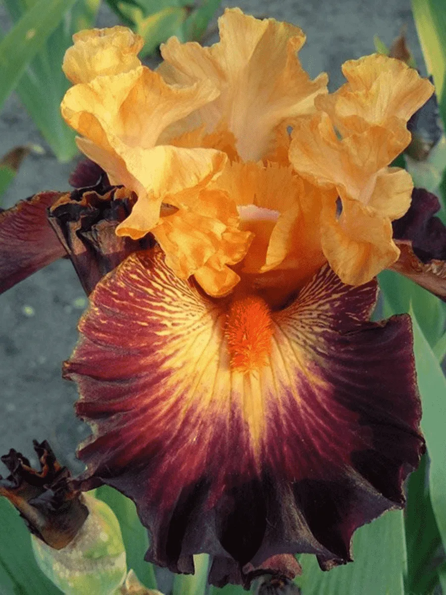 Ирис германский 'Howard Weed' пленяет взор своей изысканной красотой и благородством форм. Высокорослый многолетник достигает до полутора метров высоты, украшая сад величественными вертикальными листьями насыщенно-зелёной окраски, слегка серовато-голубоватого оттенка, словно покрытыми тонким слоем утренней дымки. Листья узколинейные, жёстко-кожистые, устремлённые вверх, придают растению стройность и элегантность. Цветёт обильно и продолжительно, начиная с конца мая и вплоть до середины июня, раскрывая крупные цветки диаметром около десяти сантиметров. Лепестки венчика окрашены в глубокий сине-фиолетовый оттенок с серебристым переливом, контрастируя с ярко-жёлтым пятном на нижних долях, придающим особую декоративность соцветиям. Корневище мощное, горизонтально разрастающееся, способствующее быстрому распространению и формированию густых куртин. Растение предпочитает солнечные места с плодородной почвой, устойчиво к засухе и зимостойко, прекрасно переносит российские климатические условия.